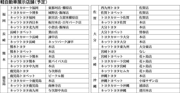 トヨタ系ディーラーが直販に乗り出すダイハツ製軽自動車の展示店舗が明らかになった。九州地区(沖縄含む)では福岡トヨタと福岡トヨペットを除く、全36社がトヨタブランドの軽販売に参入する。展示店舗数は福岡県内の5社が各2店舗、他県は1店舗づつで...