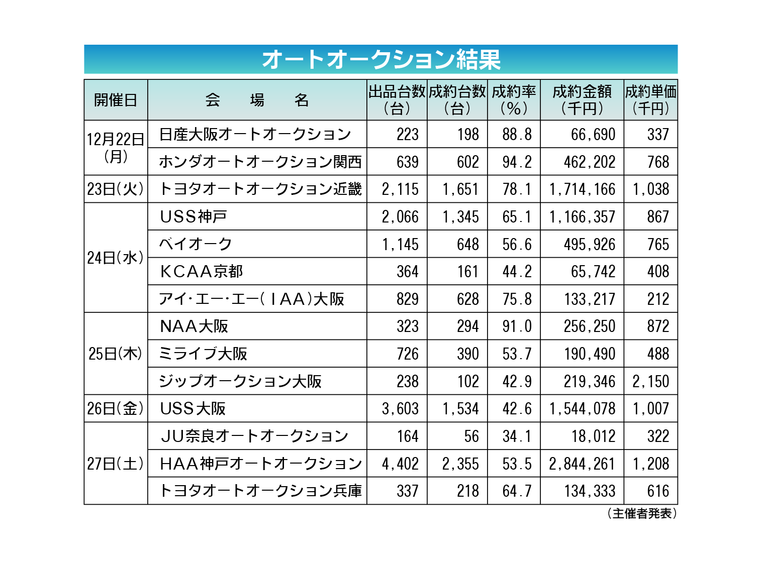 〈オートオークション結果〉近畿地区 2025/12/22~27