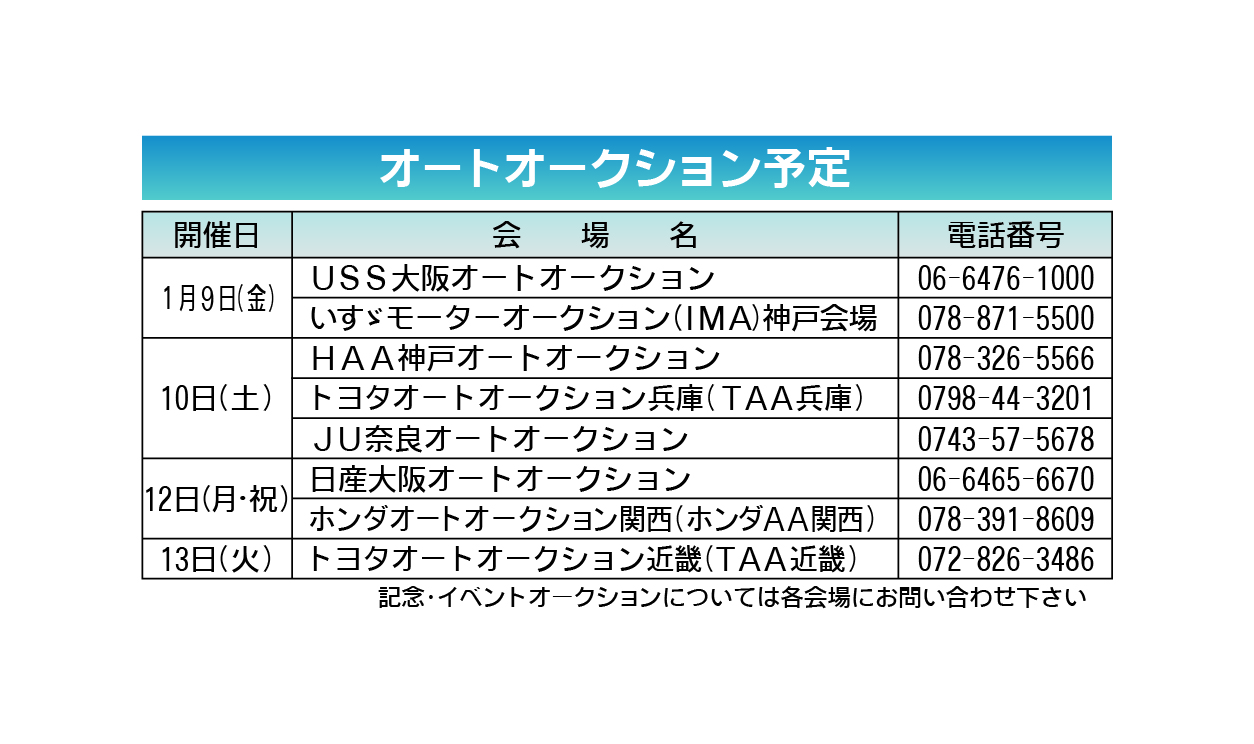 〈オートオークション予定〉近畿地区 2026/1/9~/13