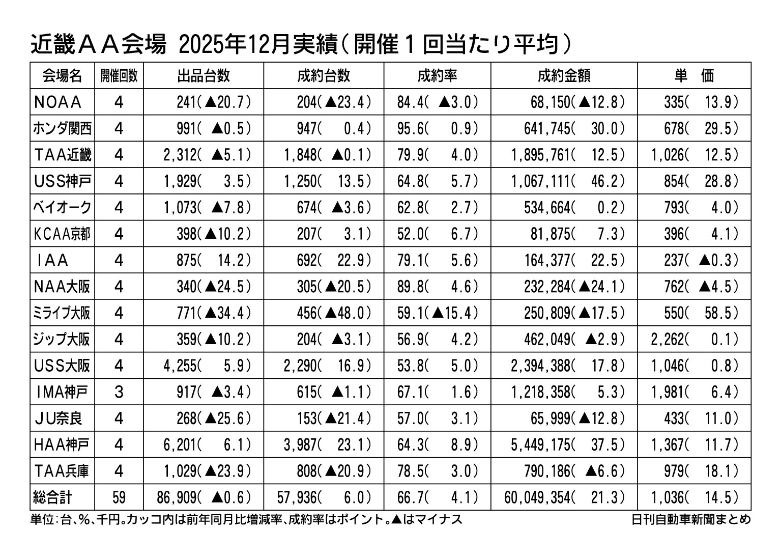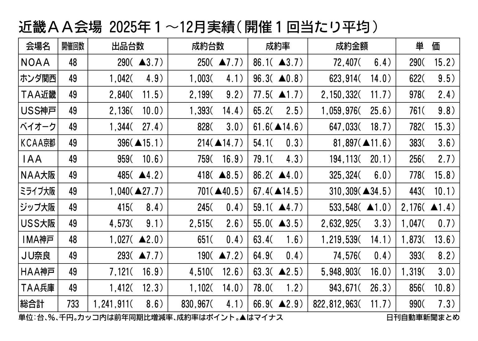 日刊自動車新聞社は、近畿地区の中古車オークション(AA)15会場の2025年(1~12月)実績をまとめた。合計の開催回数は前年比1回増の733回。新車生産が安定していたこともあり、総出品台数は前年同期比8.6%増の124万1911台で着地。...