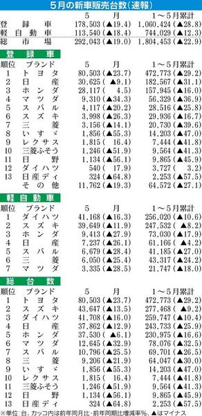 日本自動車販売協会連合会(自販連、天野洋一会長)と全国軽自動車協会連合会(全軽自協、小谷忠幸会長)が1日、発表した5月の新車販売(速報値)は、前年同月に比べ19%減となる29万2043台だった。登録車がやや持ち直した結果、減少幅は4カ月ぶ...