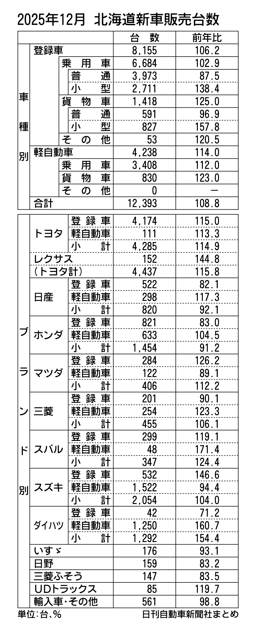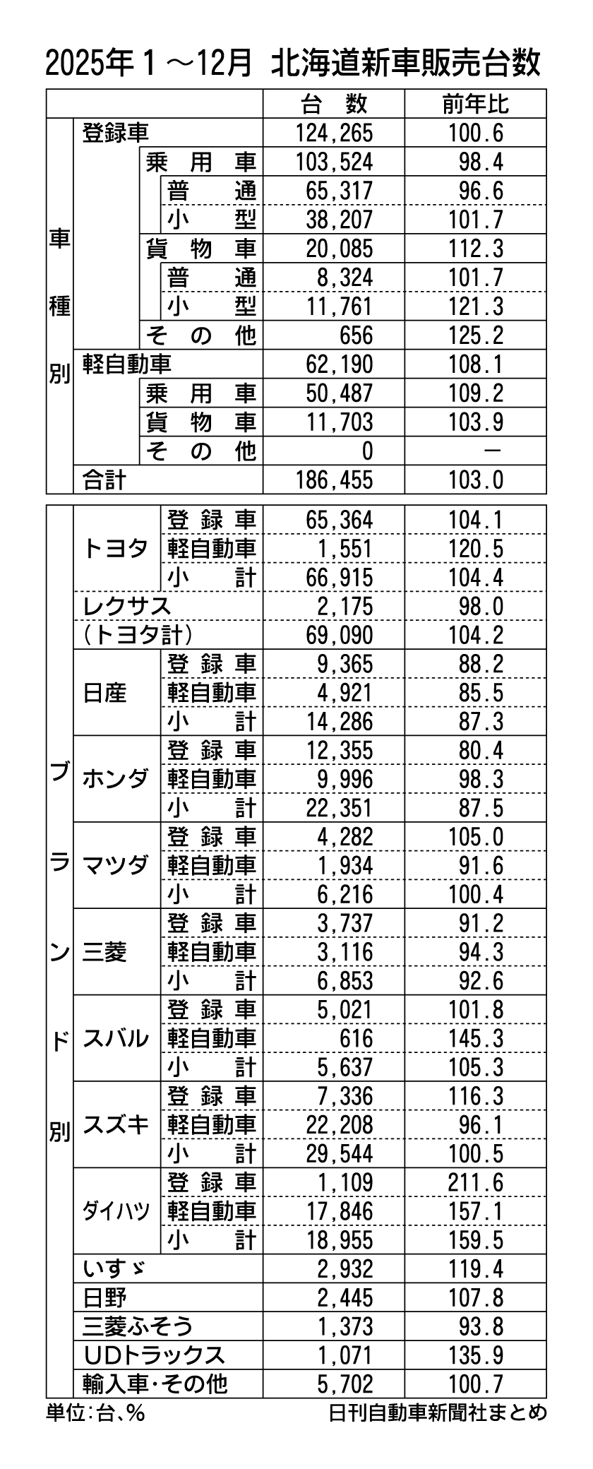 2025年の道内新車販売台数(登録車と軽自動車の合計)は、前年比3.0%増の18万6455台となった。メーカーの認証不正の影響で24年が落ち込んだこともあり、2年ぶりに前年を上回った。登録車、軽自動車ともに2年ぶりの前年超え。12月は前年同...