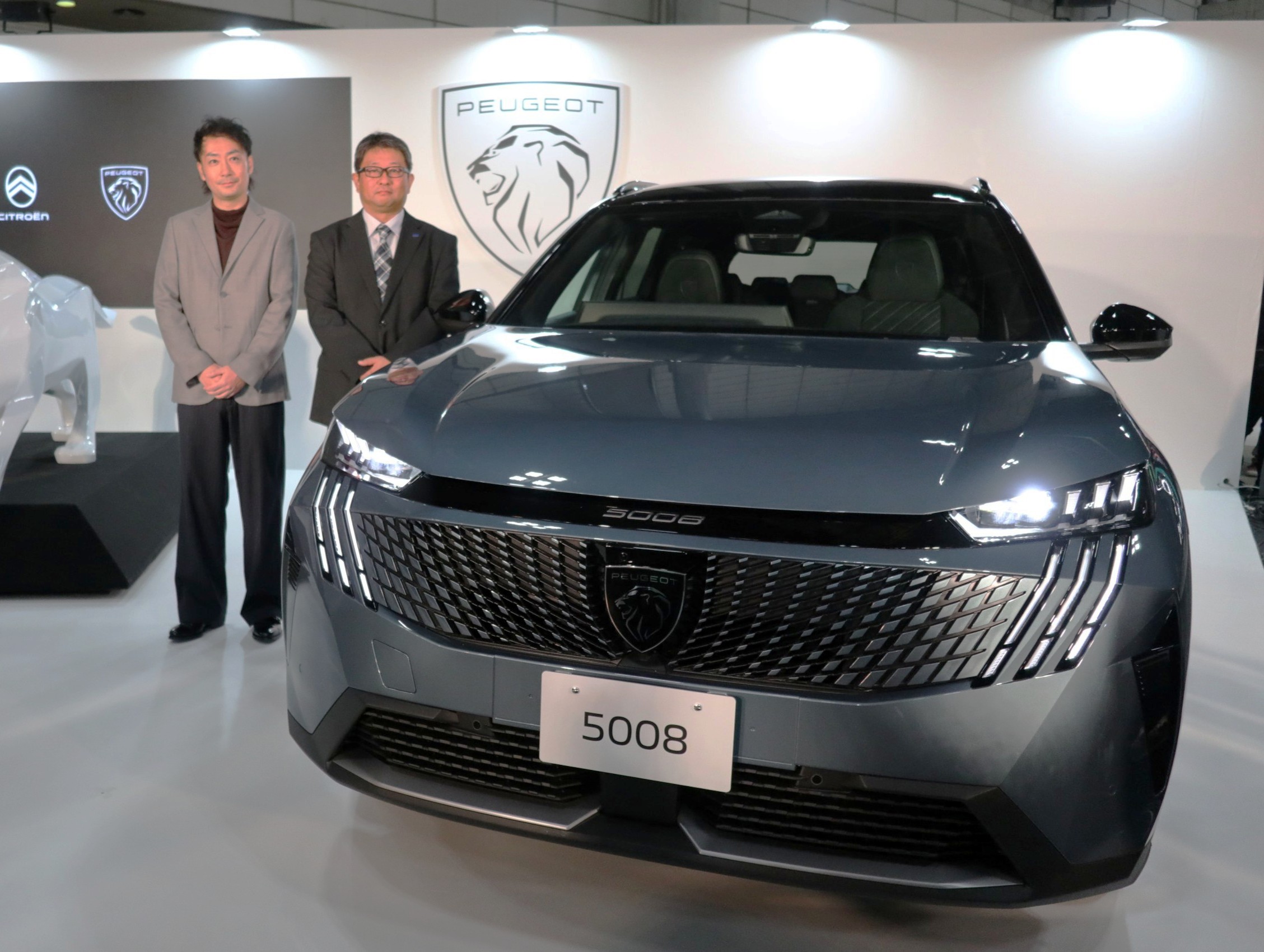 プジョーはSUV「5008」。2025年に全面改良したフラッグシップモデル「3008」の兄弟車にあたる。ロングボディ化し、3列シートで7人が乗車可能だ。パワートレインはガソリンエンジンと電動モーターのハイブリッド。特別仕様車「ブラックエディション」も近日発売予定だ。