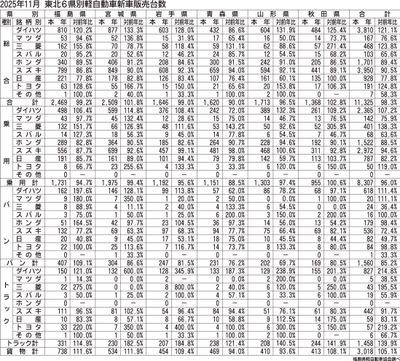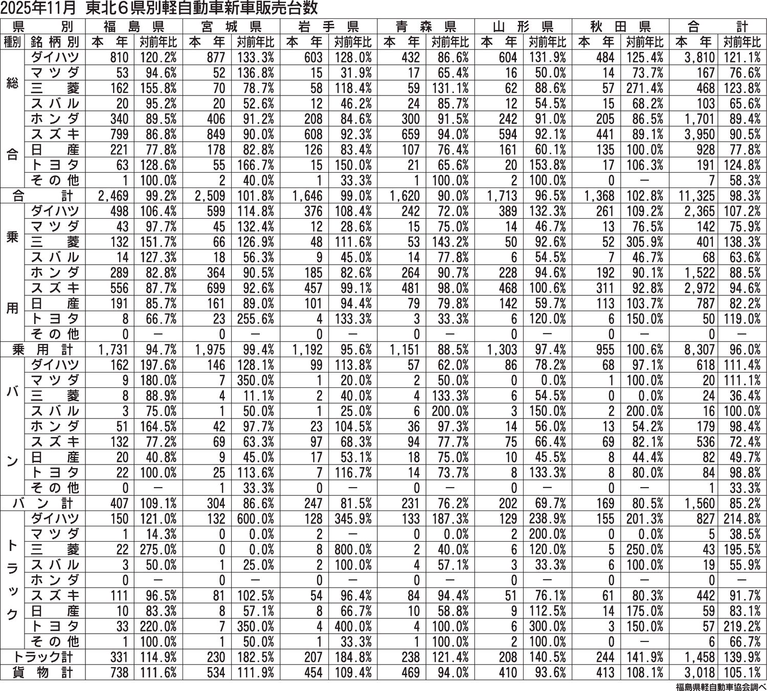 〈2025年11月 東北6県別軽自動車新車販売台数〉