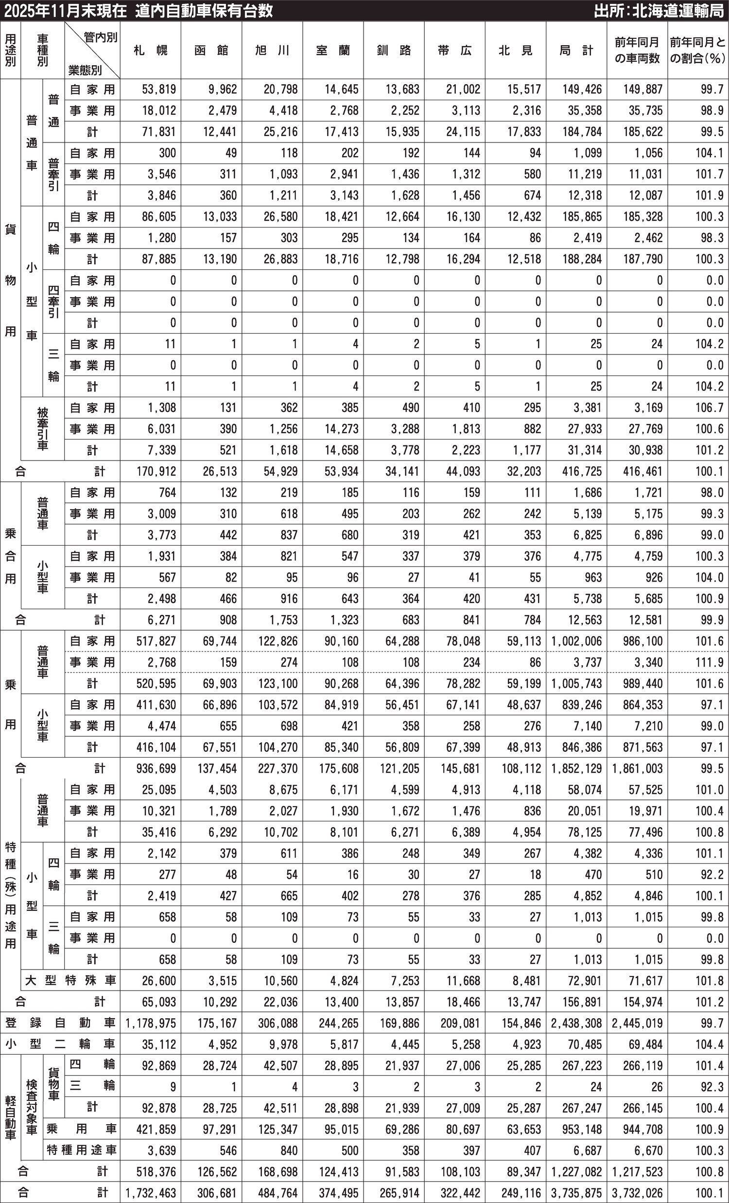 〈北海道2025年11月車検台数〉3カ月ぶり減