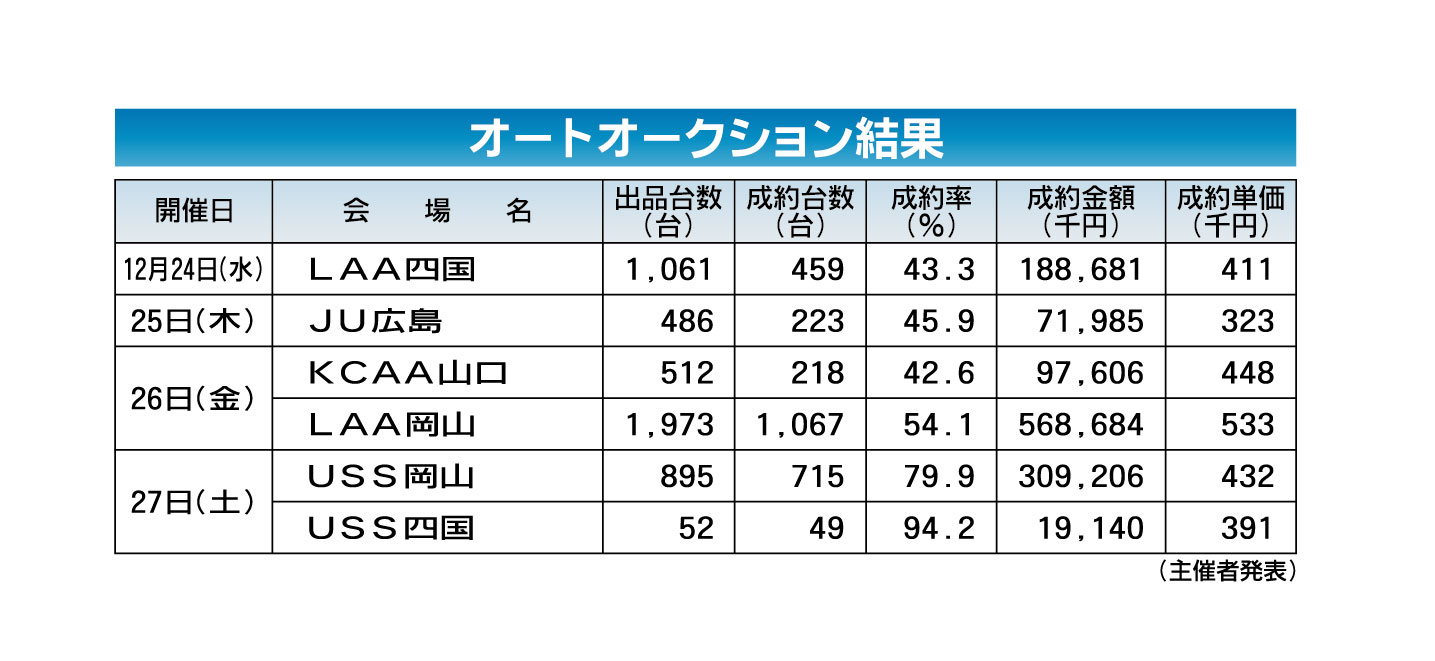 〈オートオークション結果〉中・四国地区 2025/12/24~27