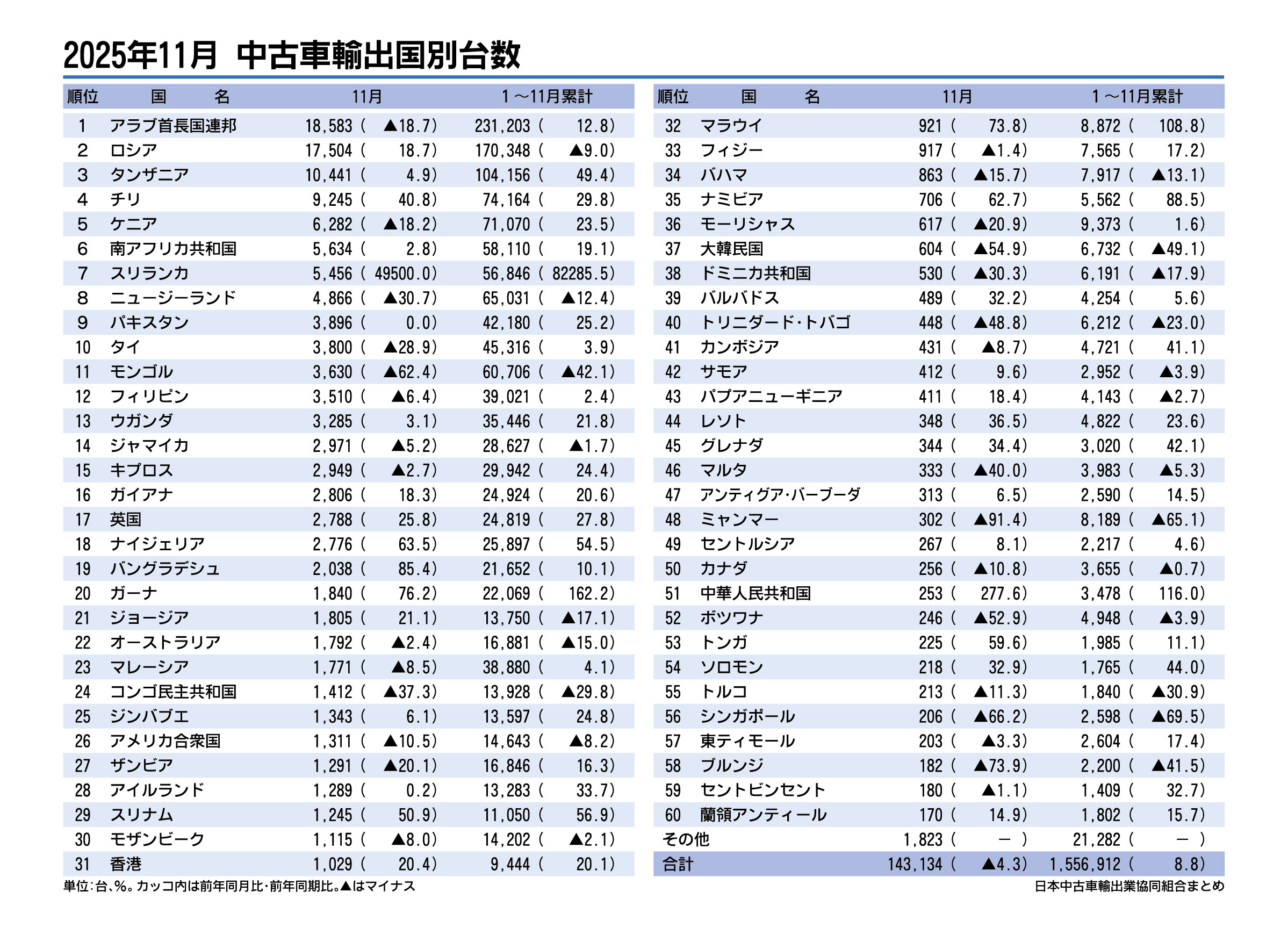 日本中古車輸出業協同組合(JUMVEA、佐藤博理事長)が公表した11月の中古車輸出台数(車両価格20万円以上)によると、2025年1~11月の累計台数が前年同期比8.8%増の155万6912台となり、12月を含めずに前年(156万6621...