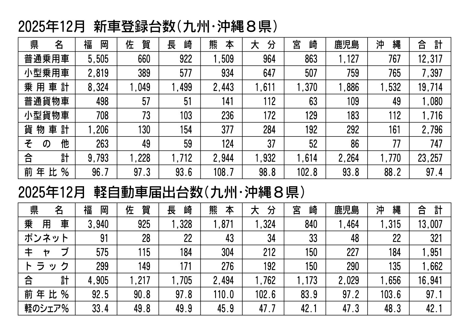 九州・沖縄地区の2025年12月の新車販売台数(登録車と軽自動車合計)は、前年同月比2.7%減の4万198台と、2カ月連続の前年割れとなった。登録車、軽自動車ともに前年実績を下回った。ただ、車種によっては大きく伸長。登録車では小型乗用と小型...