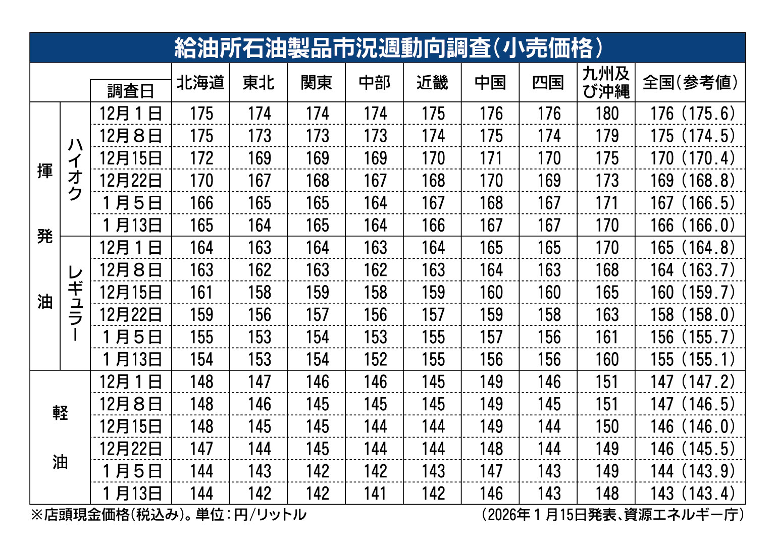 経済産業省が1月15日発表したレギュラーガソリン1リットル当たりの店頭小売価格(13日時点)の全国平均は、前週より60銭安い155円10銭だった。下落は9週連続で、4年7カ月ぶりの安値水準。暫定税率廃止に伴う価格低下が継続した一方、石油元売...