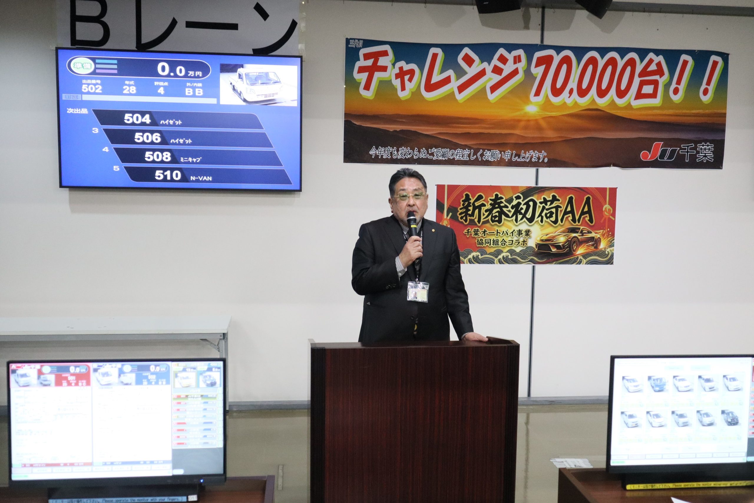 【千葉】JU千葉(千﨑悟之理事長、千葉市稲毛区)は、「2026年新春初荷オートオークション(AA)」を開催した。昨年の初荷オークションを100台余り上回る1703台を出品。成約率も72.5%となる上々の滑り出しとなった。競り開始前のあいさつ...