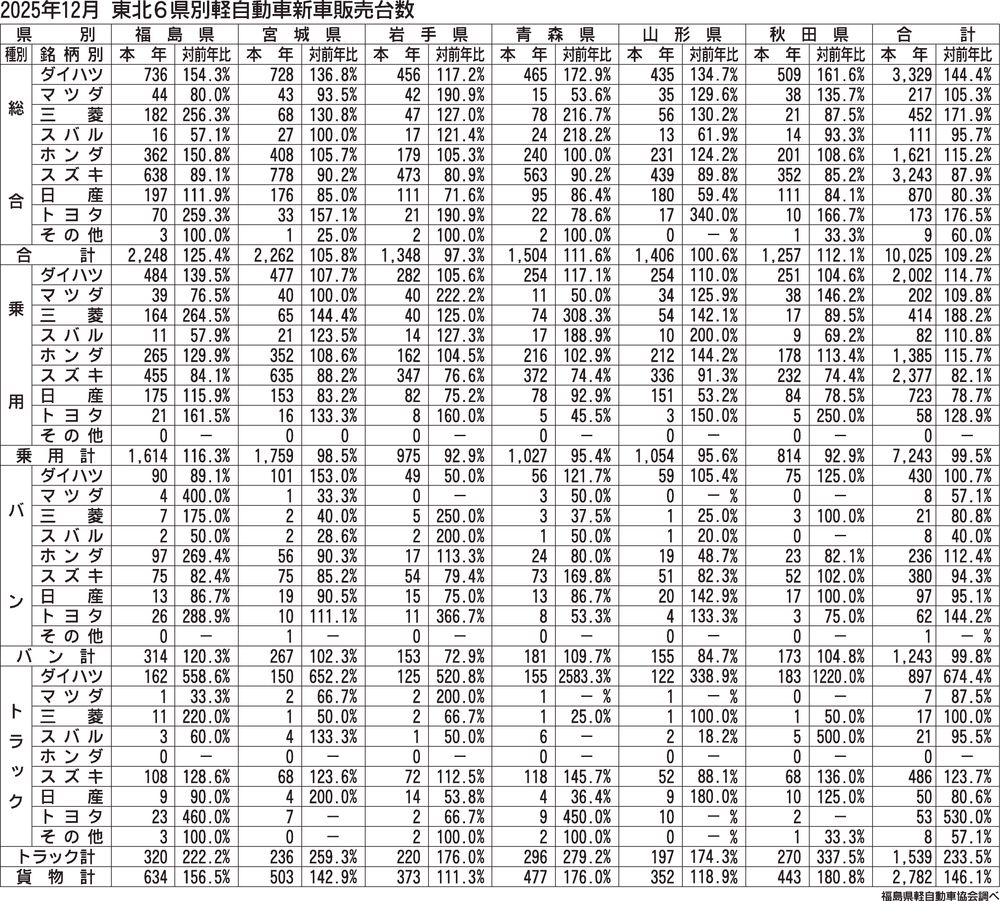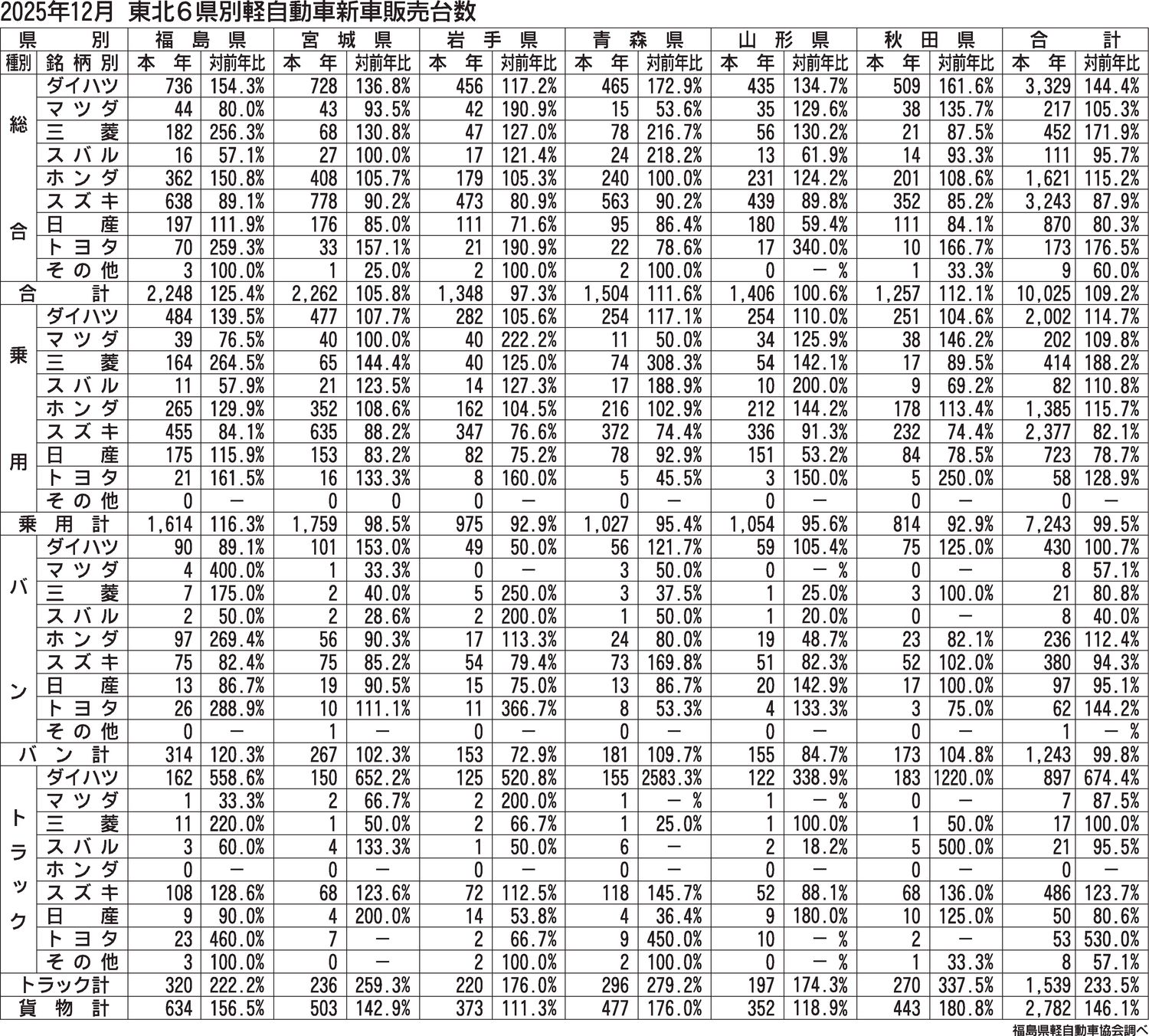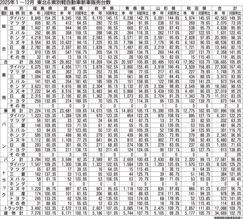 東北6県全体の2025年軽自動車新車販売台数は、前年比5.8%増の13万6665台と2年ぶりに前年実績を上回った。新型車の発売と認証問題の反動の影響などが押し上げ要因となった。ただ、半導体不足などによる新車供給が緩和した23年と比較すると...