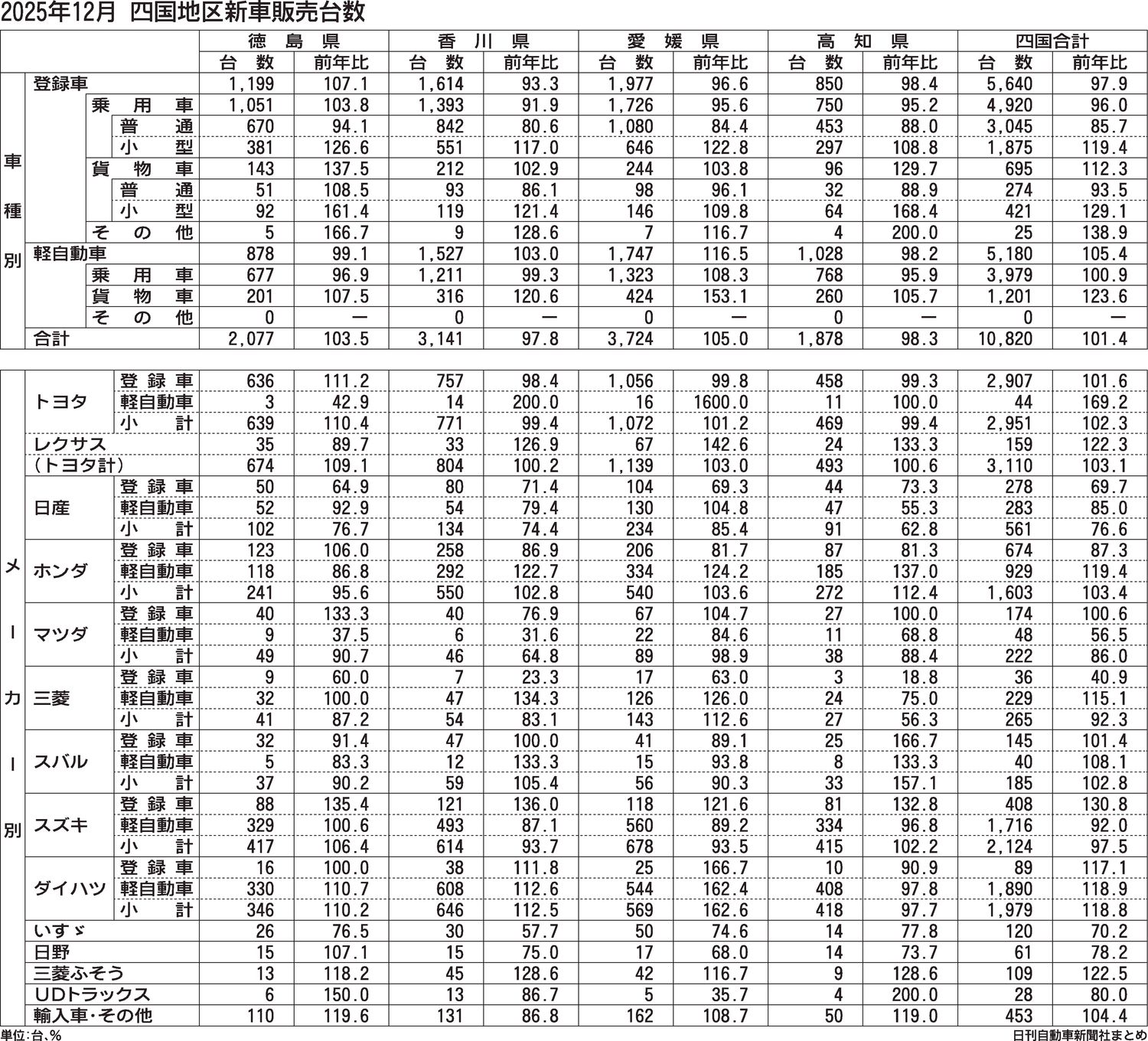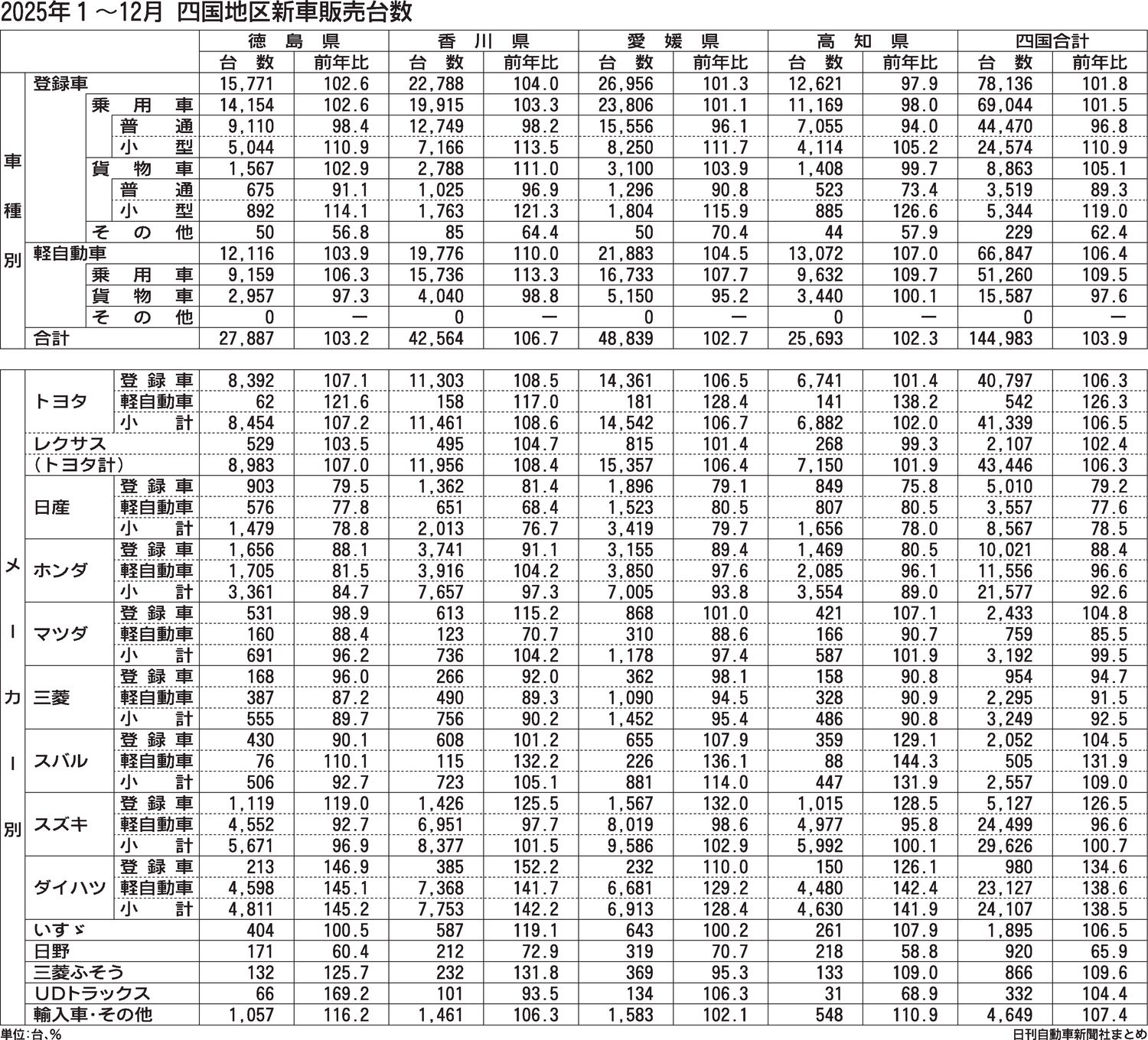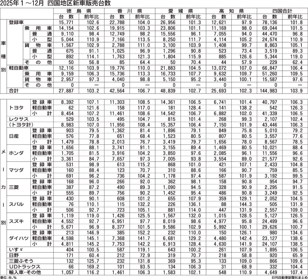 四国地区2025年(1~12月)の新車販売台数(登録車+軽自動車)は、前年比3.9%増の14万4983台と2年ぶりに増加した。ダイハツ工業の認証不正問題の反動などで増加した1~6月(7万4694台、13.0%増)で、7~12月(7万289...