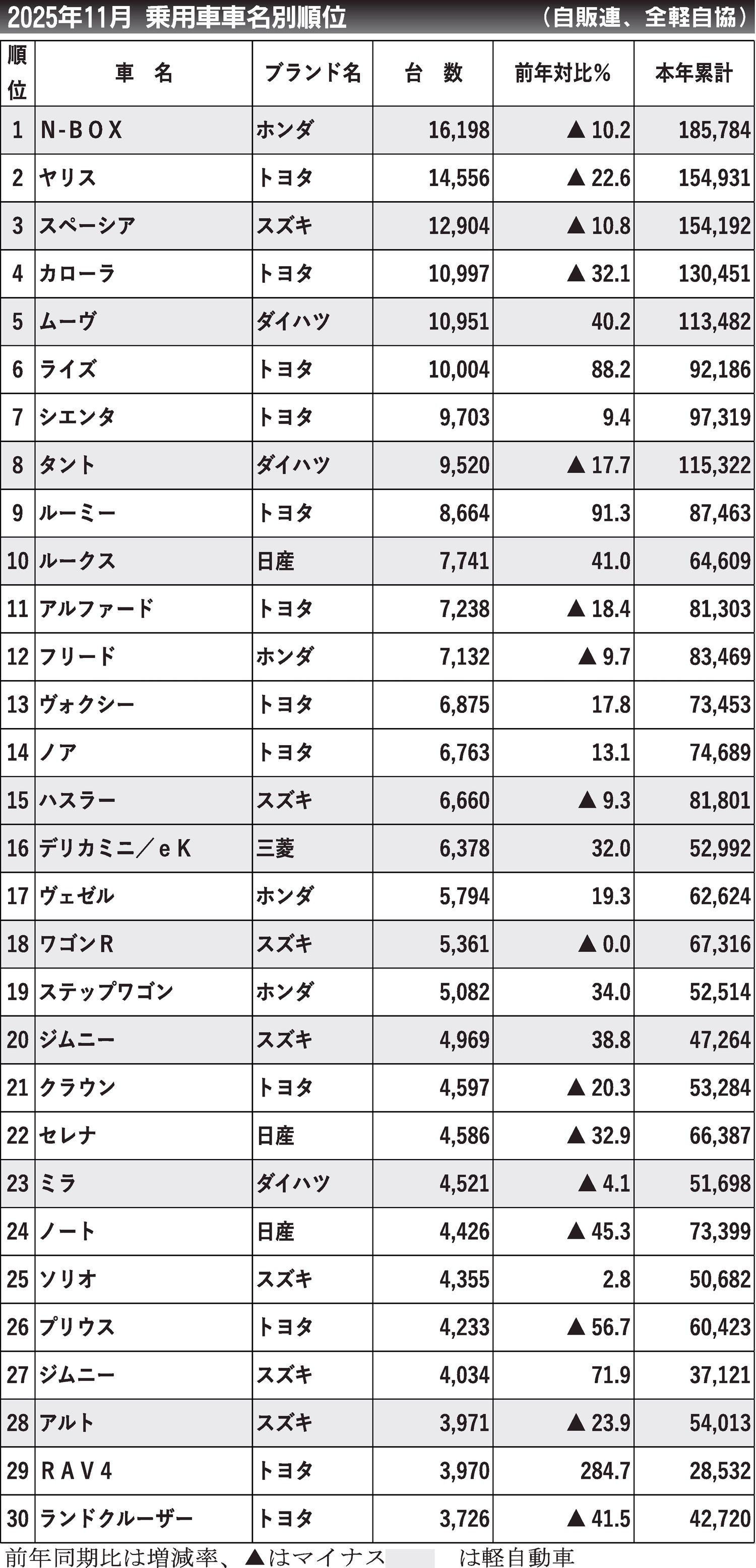 〈2025年度上期(4~9月)乗用車車名別順位〉