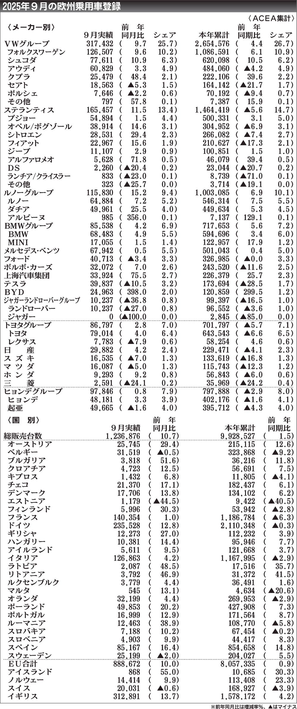 欧州自動車工業会(ACEA)がまとめた2025年9月の新車販売台数(主要31カ国、乗用車)は、前年同月比10.7%増の123万6876台と3カ月連続で増加した。電気自動車(EV)が同21.9%増、プラグインハイブリッド車(PHV)が同62...