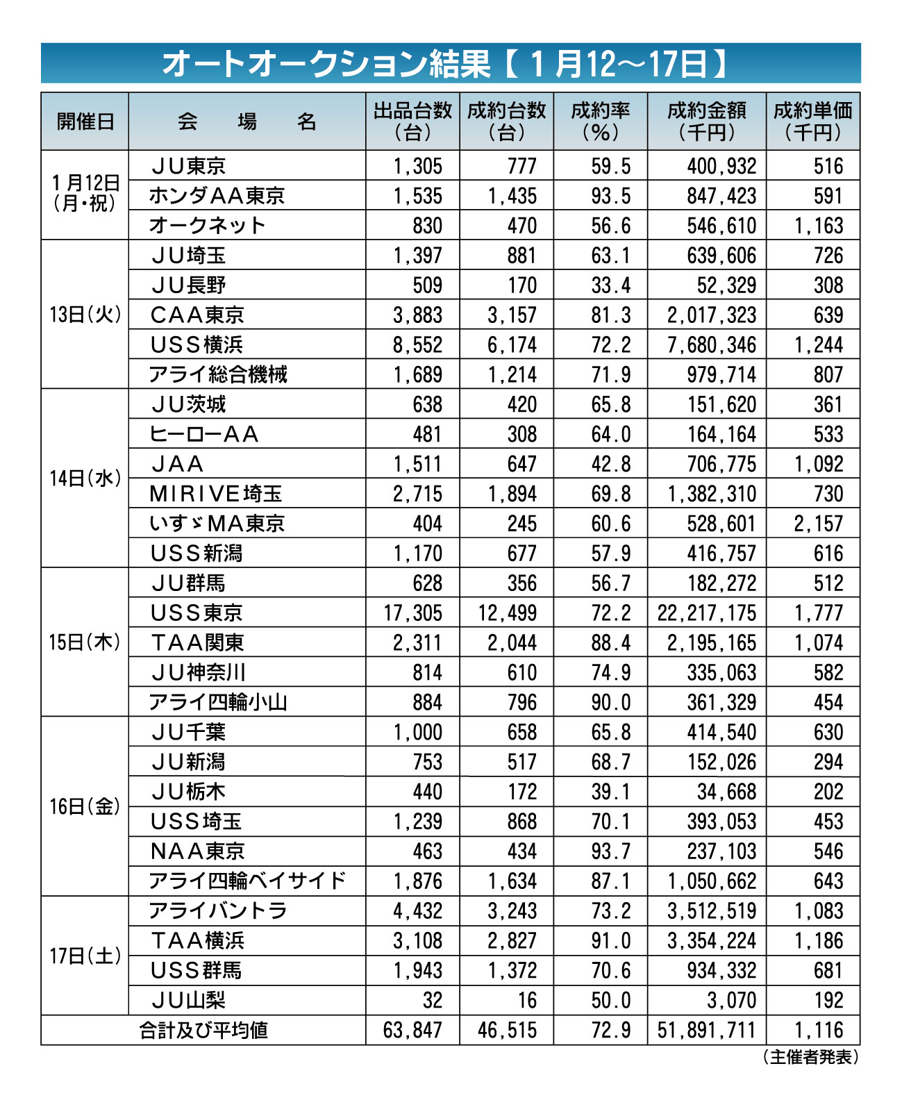 〈オートオークション結果〉首都圏 2026/1/12~17