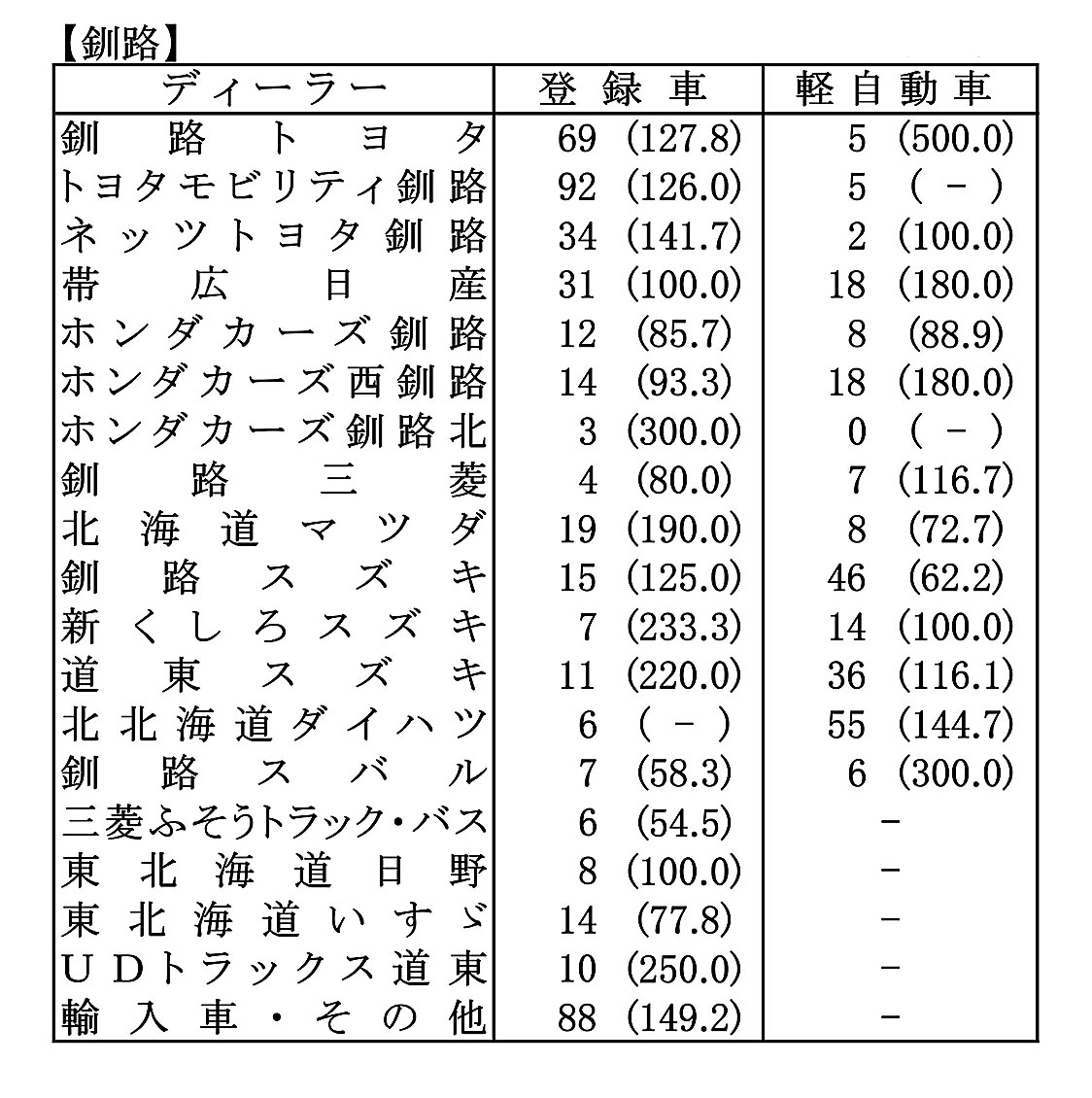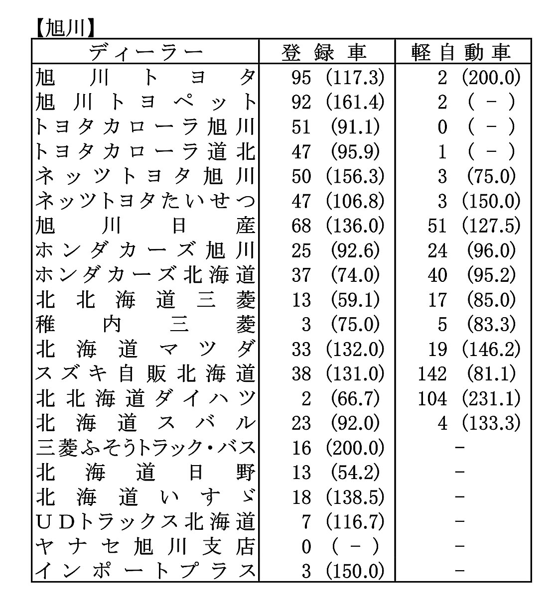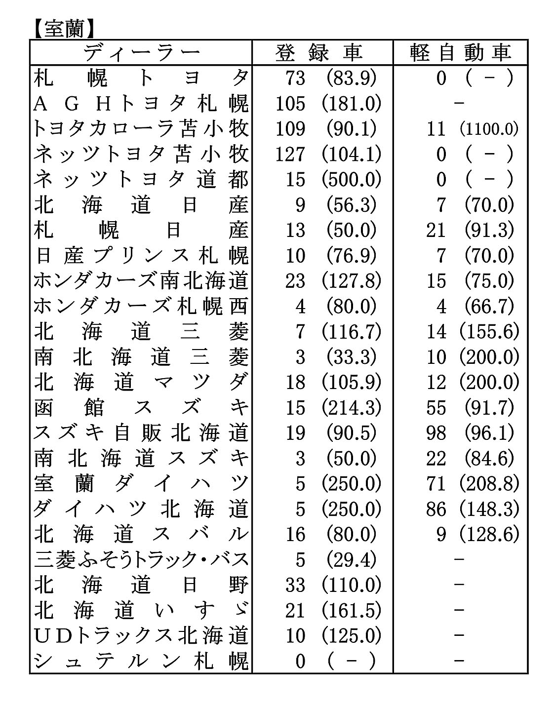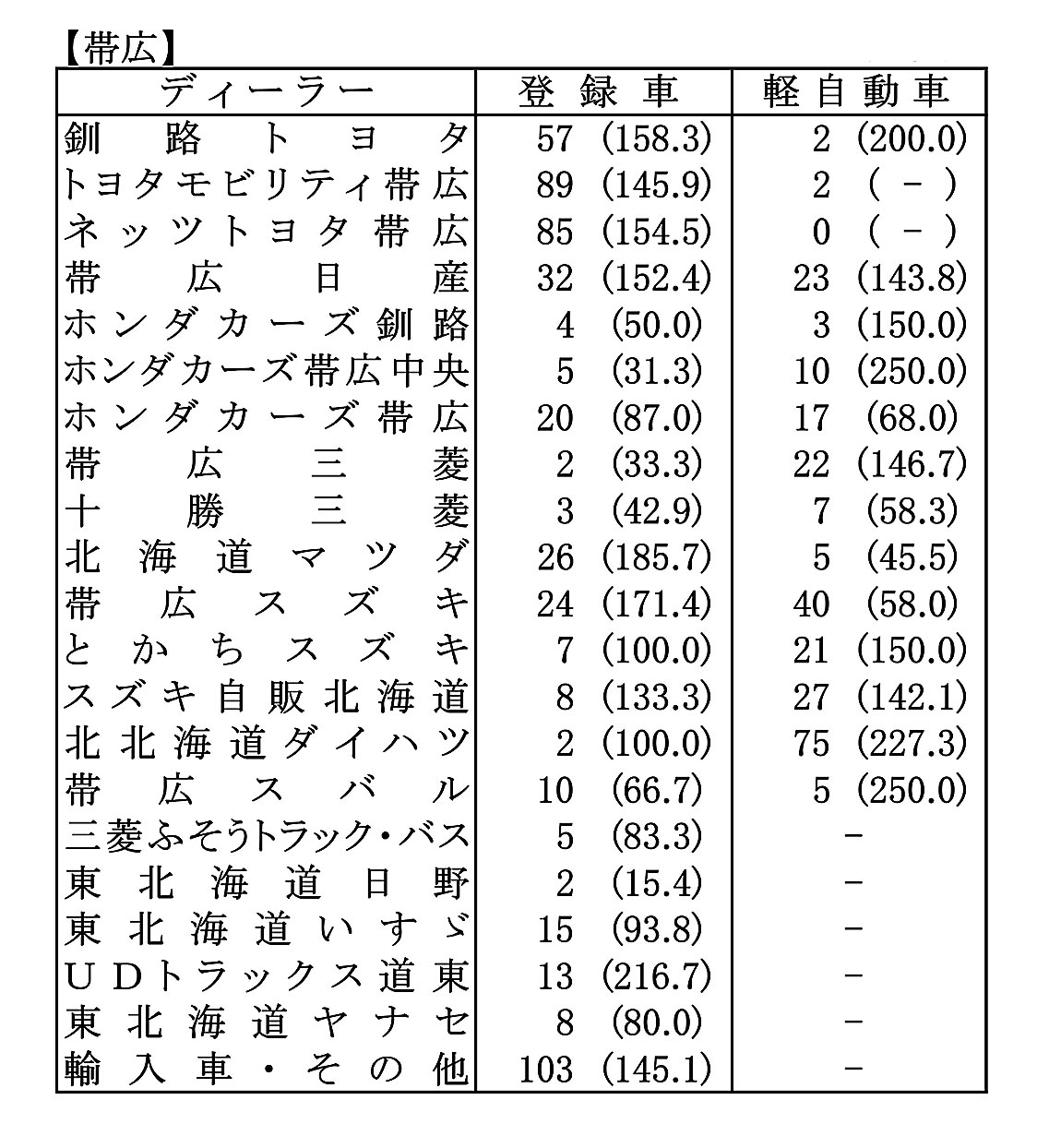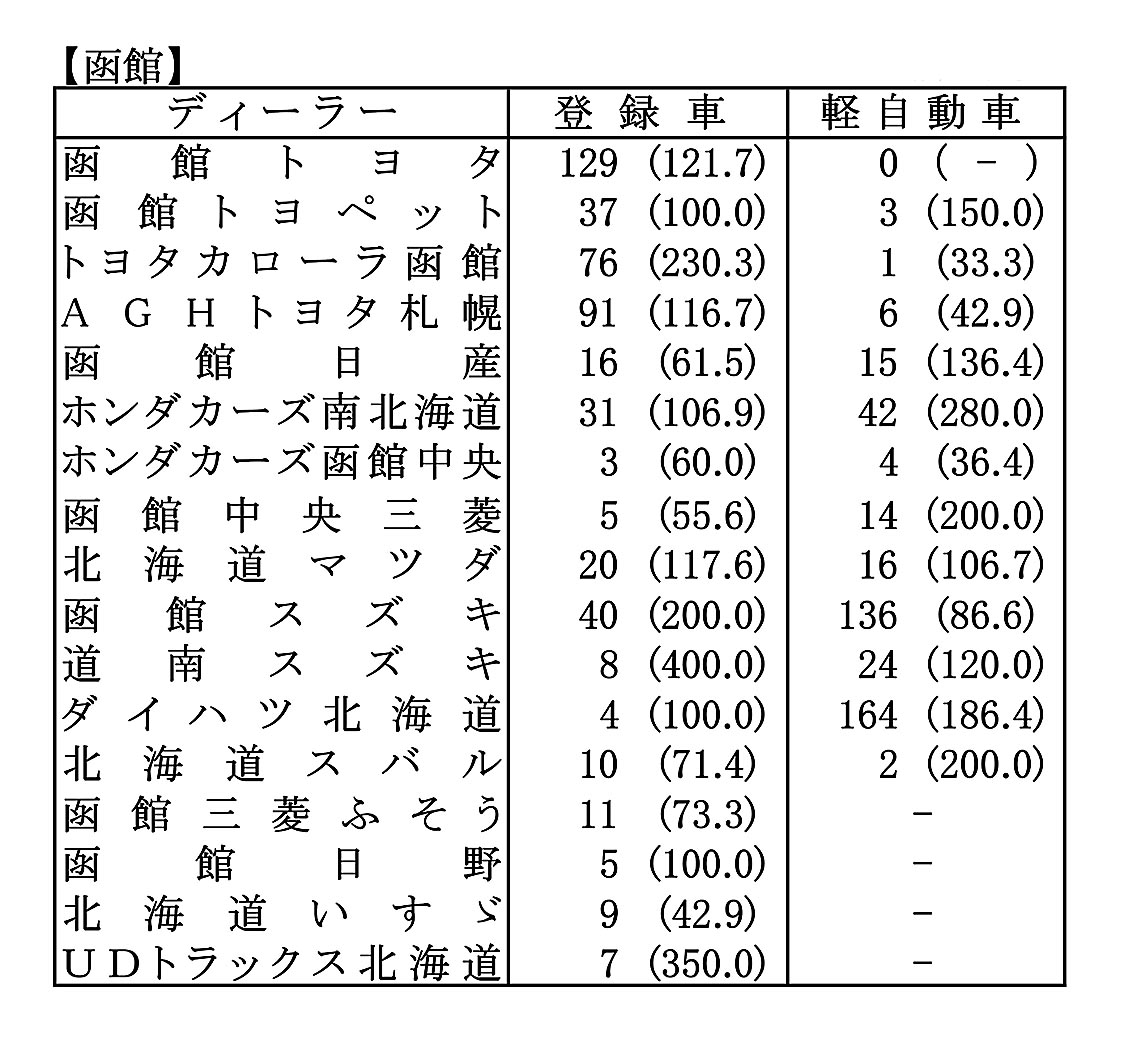 〈2025年12月度全道管内別ディーラー別新車登録・届け出台数(カッコ内は前年同月比)〉※札幌管内ホンダ系・スズキ系の登録台数は自販連正会員分