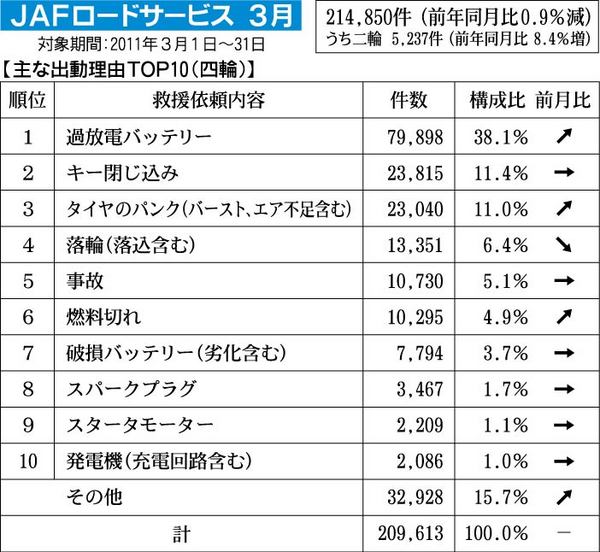 日本自動車連盟がまとめた3月のロードサービス(RS)実施状況は、総実施件数が前年同月比0・9%減の21万4850件となった。3月11日に発生した東日本大震災の影響も大きかった。JAF特別支援隊を派遣した東北本部では前年同月比17%増と大幅...