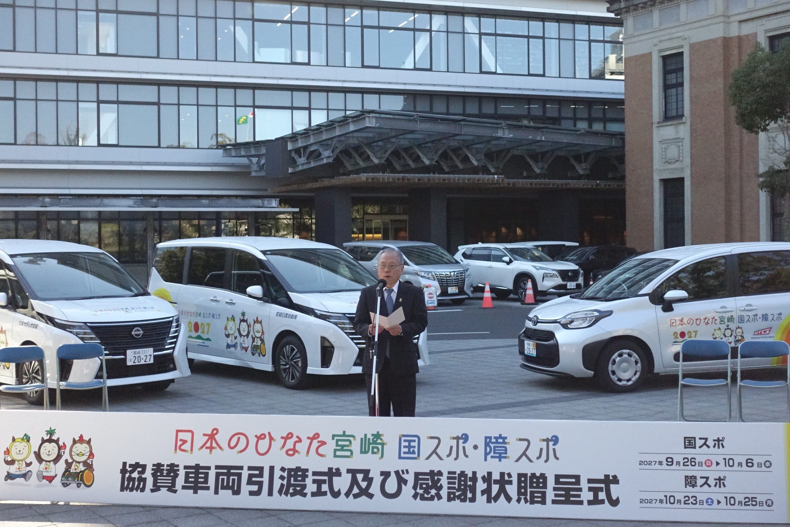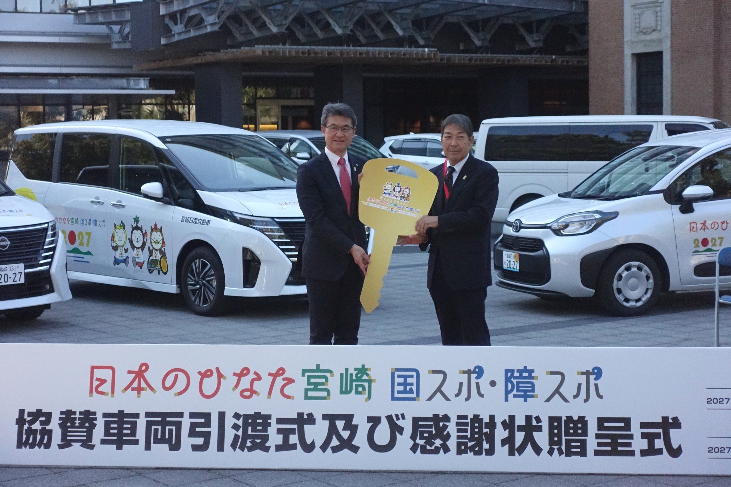 第81回国民スポーツ大会・第26回全国障害者スポーツ大会「日本のひなた宮崎国スポ・障スポ」の協賛車両の引き渡し式が、宮崎市内で行われた。県内新車ディーラー10社が合計21台を貸与した。同大会は2027年に宮崎県内で開かれる。車両には宮崎県の...