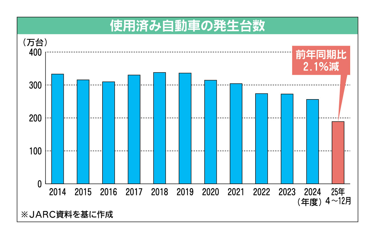 2025年4~12月の使用済み車発生台数、2.1%減の189万台 11月は9.6%減 JARC調査