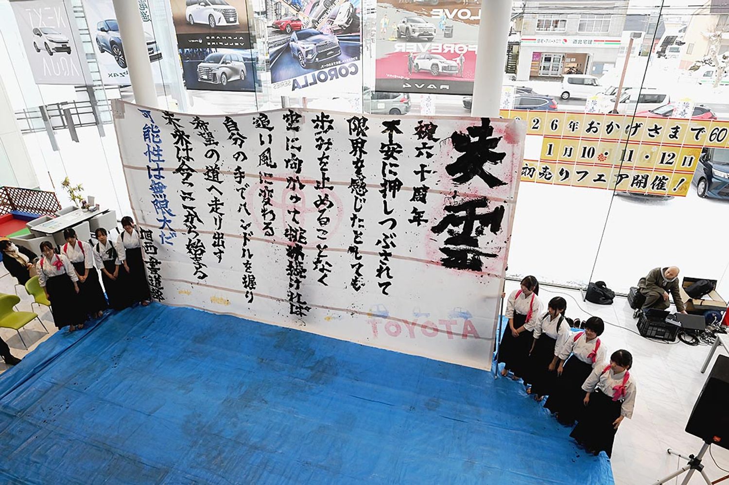 【旭川】トヨタカローラ道北(岡田和人社長)は、末広店で北海道旭川西高校書道部の実演イベントを開催した。 パフォーマンスは11人の生徒がBGMに合わせながら縦2メートル、横4メートルの用紙に揮毫した。内容はカローラ道北が2026年7月に創立...