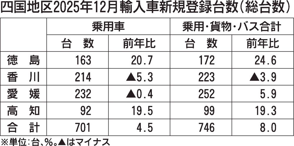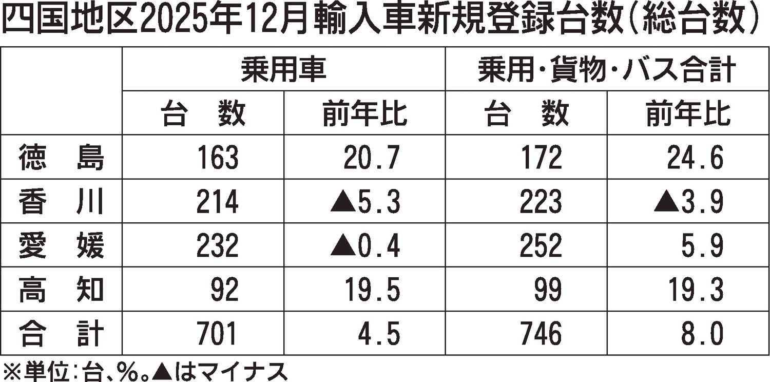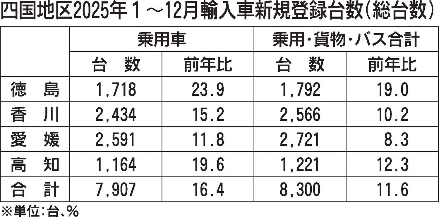 四国地区2025年1~12月の新規輸入車登録台数(外国メーカー車、日本メーカー車)は、前年比11.6%増と大幅に増加した。四国4県で前年実績を上回り、徳島は同19.0%増だった。車種別では乗用車が同16.4%増だった。 外国メーカー車は同...
