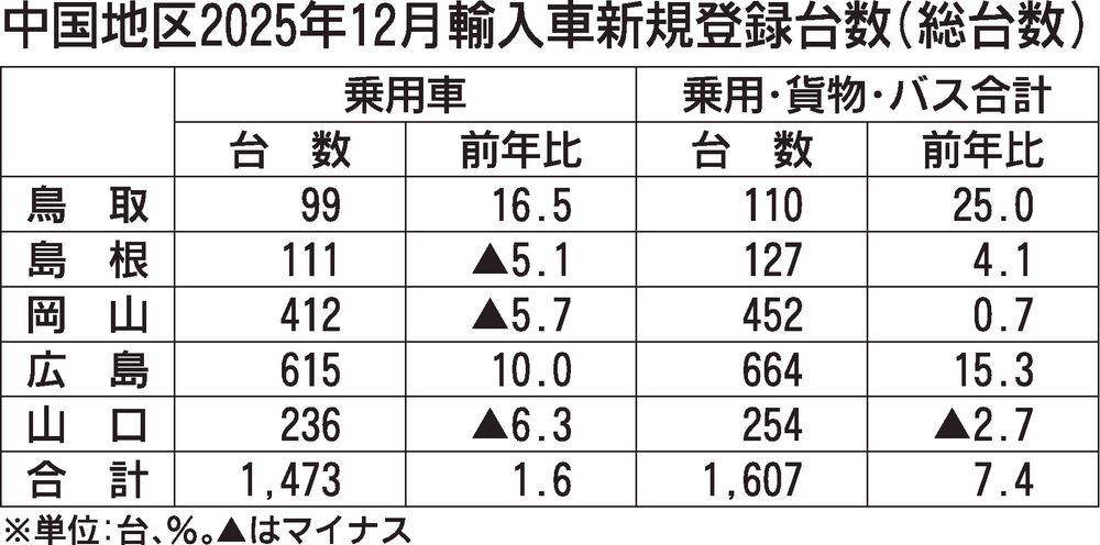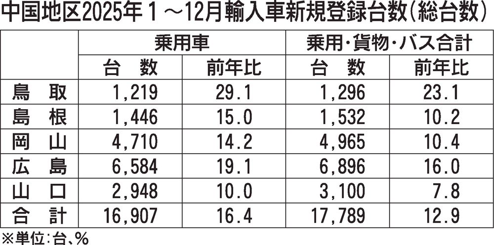 日本自動車輸入組合(JAIA)の発表によると、2025年の中国地区輸入車新規登録台数(外国メーカー車と日本メーカー車)は、前年同期比12.9%増の1万7789台だった。中国5県全県で前年を上回り、2年ぶりに増加した。車種別では乗用車が同1...