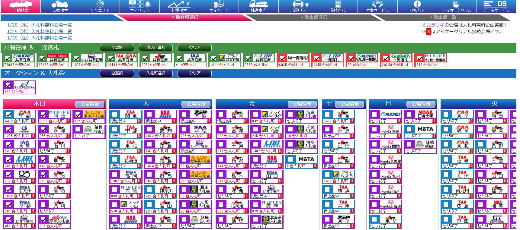 オークネット、TAA 11会場、Honda 6会場、いすゞ 3会場、NAA 4会場、SUZUKI、日産大阪、日産プラザソル 6会場、AEP、CAA 4会場、IAA、JU 33会場、KCAA 4会場、LAA 2会場、LUM 5会場、SAA、ZIP 2会場、アライ 4会場、オリックス 4会場、ゼロ・カーセレ 6会場、ヒーロー、ベイオーク、ミライブ 3会場、SOGO建機4会場、アライバイク、オークネットバイク、MOTA車買取Plus 、オークスモビリティ(順不同)