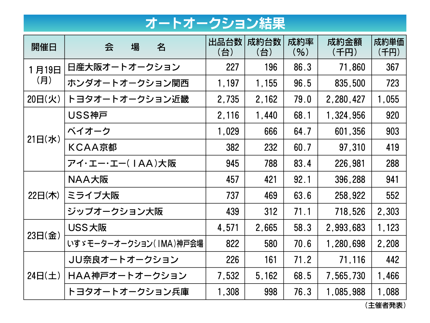 〈オートオークション結果〉 近畿地区 2026/1/19~24