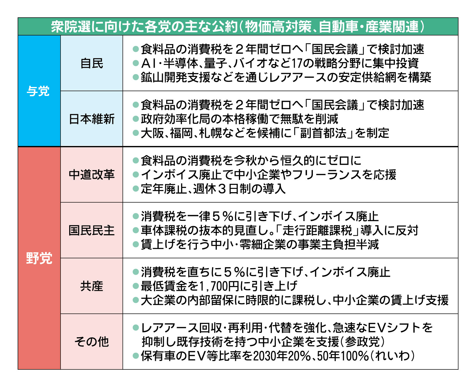第51回衆議院議員選挙が1月27日に公示された。足元の物価高を背景に、消費税率の引き下げや廃止を訴える政党が多く、物価高対策が1つの争点となりそうだ。各党がガソリンの暫定税率(当分の間税率)や環境性能割の廃止などを掲げた2025年参院選と比...