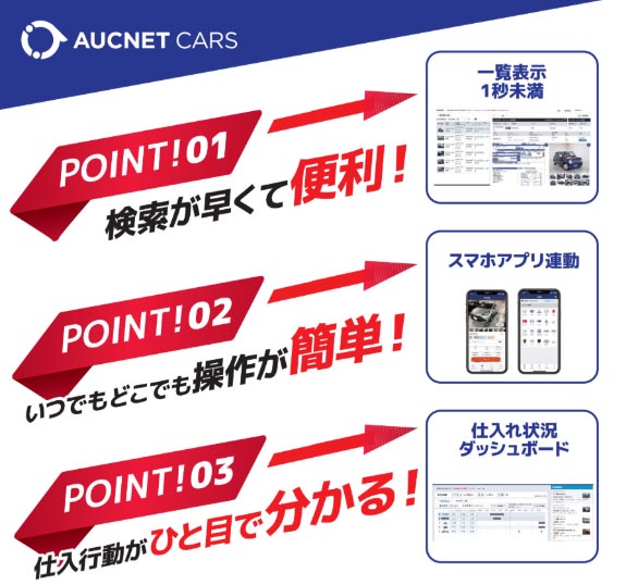 株式会社オークネットは、40年以上にわたり中古車流通のデジタル化を牽引し、全国約19,000社のグループ会員様を支援してきました。仕入れから販売、業務管理までを網羅する中古車流通プラットフォーム「AUCNET CARS」、「AucNeo Station HYPER」を提供しています。
