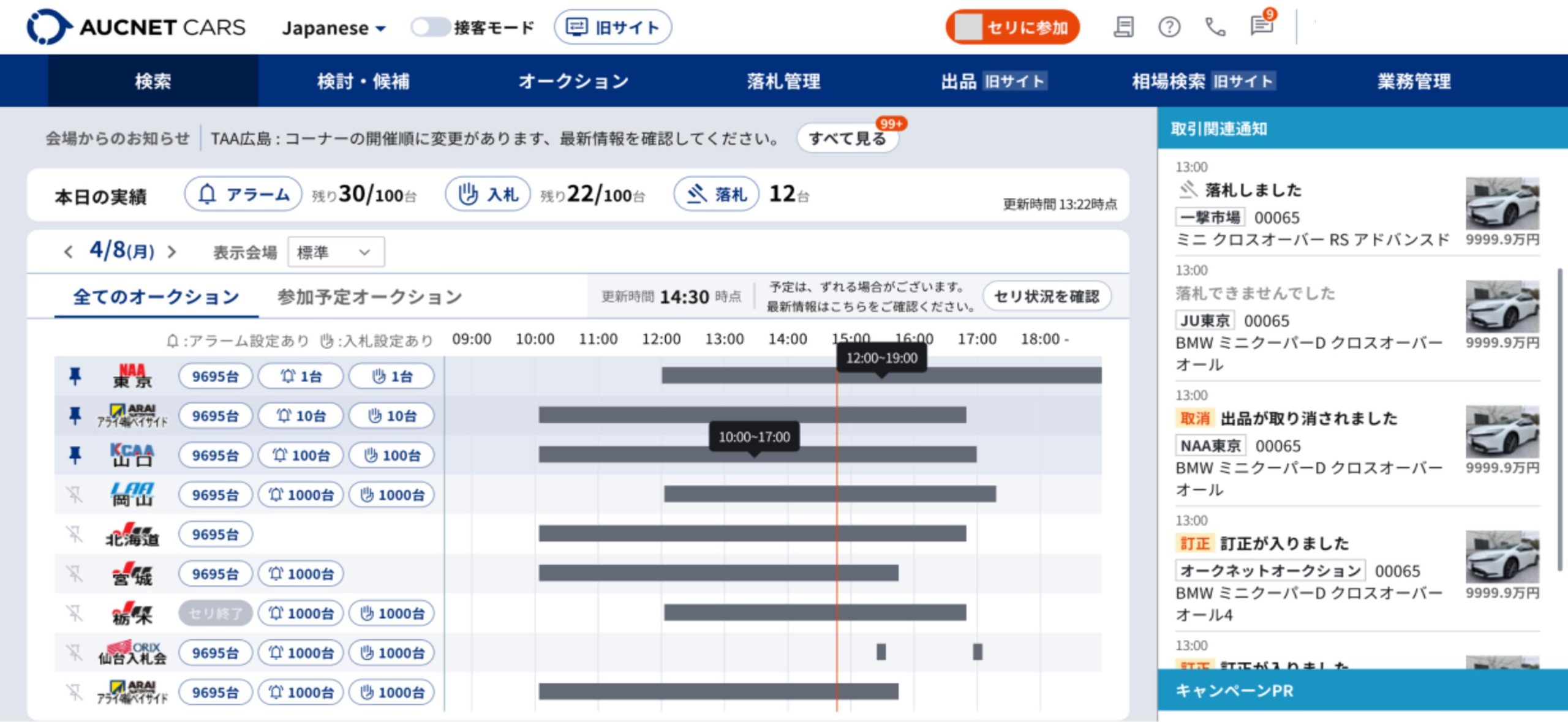 全国113会場と提携し、国内出品台数の約70%に相当する年間500万台へアクセス可能です。「3会場・3レーン同時表示画面」や、予算・台数に合わせた「自動応札機能」により、店舗にいながら効率的な仕入れを実現します。ブラウザ版とリアルタイム連動するスマホアプリも備え、外出先でも商機を逃しません。