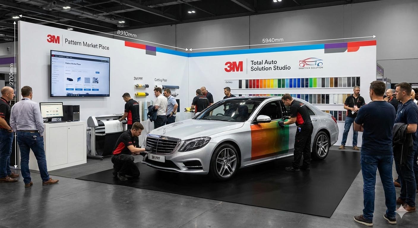 ワイエムジーワン(YMG1)は、自動車関連事業者向けに高品質なカーラッピングサービスを提案する。展示の中心となるのは、2025年9月より国内販売が開始された3Mプロテクションラップフィルム(3MPWF)の商品紹介と施工デモンストレーションを行う。