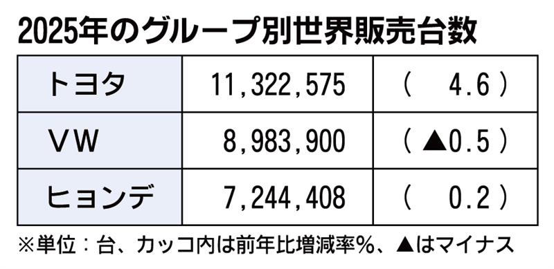 2025年のグループ別世界販売台数で、トヨタ自動車グループが6年連続で世界首位となった。ダイハツ工業と日野自動車を含むグループの世界販売台数が前年比4.6%増の1132万2575台と2年ぶりにプラスに転じ、過去最高を記録した。2位のフォルク...