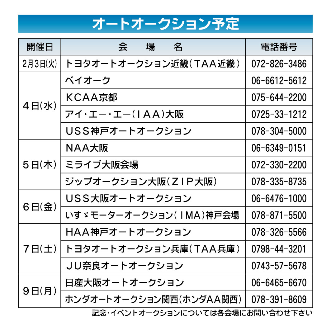 〈オートオークション予定〉近畿地区 2026/2/3~9