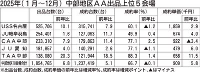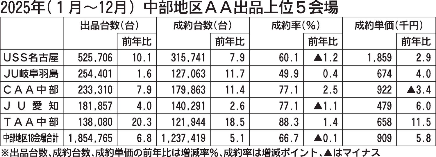 2025年(1~12月)の中部地区中古車オークション(AA)18会場の実績(主催者発表、日刊自動車新聞社集計)は、出品台数が前年比6.8%増の185万4765台だった。昨夏以降、大型会場で設備投資が相次いだことに加え、記念AAで多くの出品...