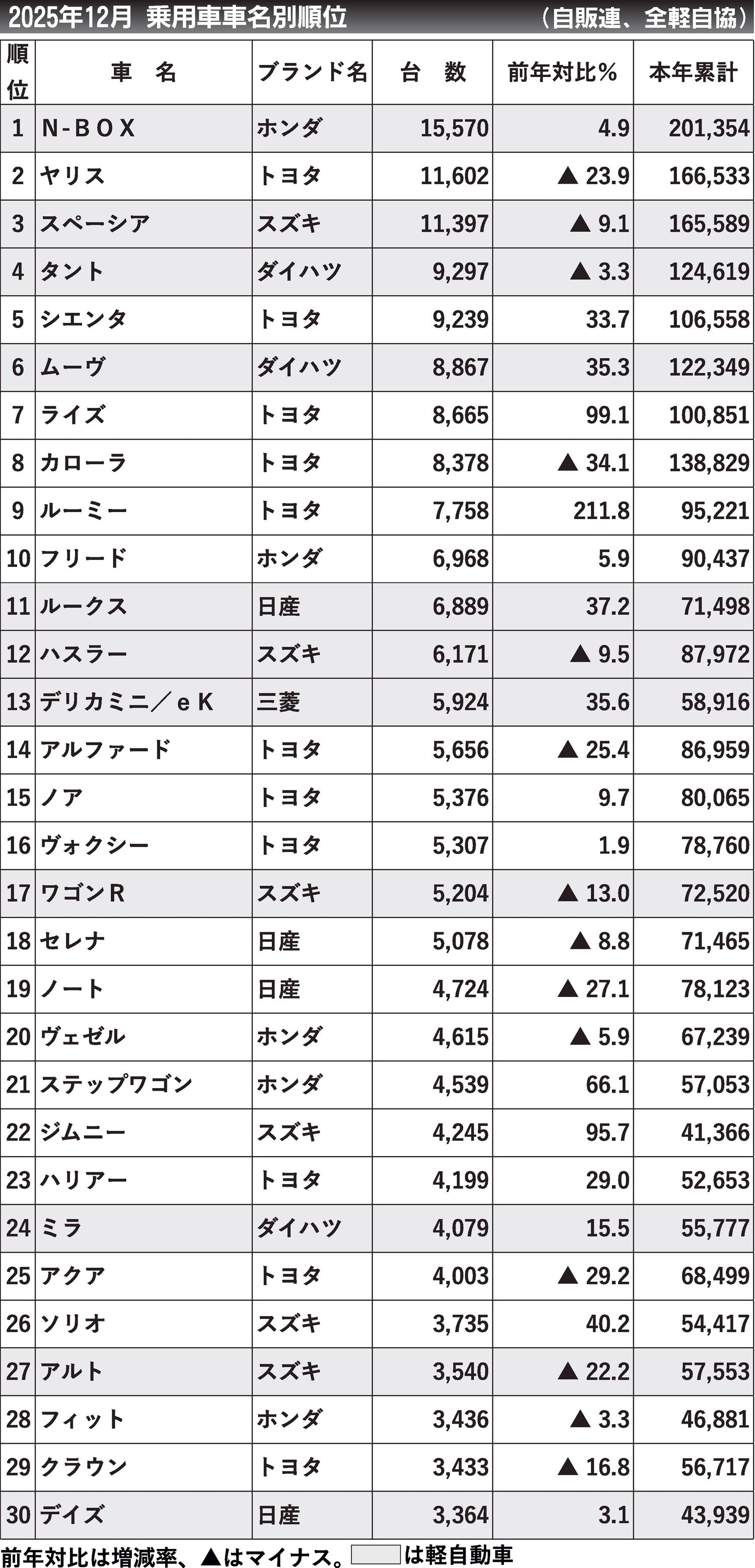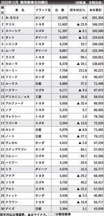 2025年12月の車名別国内新車販売台数(登録車と軽自動車の合計)は「N―BOX(エヌボックス)」が2カ月連続で首位だった。2位「ヤリス」は、販売台数は減少したが、登録車では16カ月連続1位だった。...