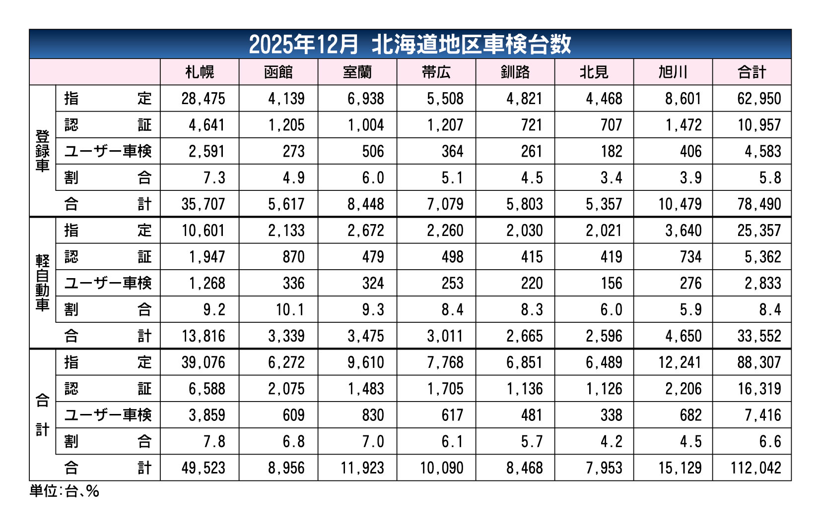 北海道の2025年12月の継続検査(車検)台数(軽自動車を含む)は、前年同月比7.2%増の11万2042台で、2カ月ぶりに前年を上回った。登録車は同4.5%増の7万8490台、軽自動車は同14.3%増の3万3552台で、いずれも2カ月ぶりに...