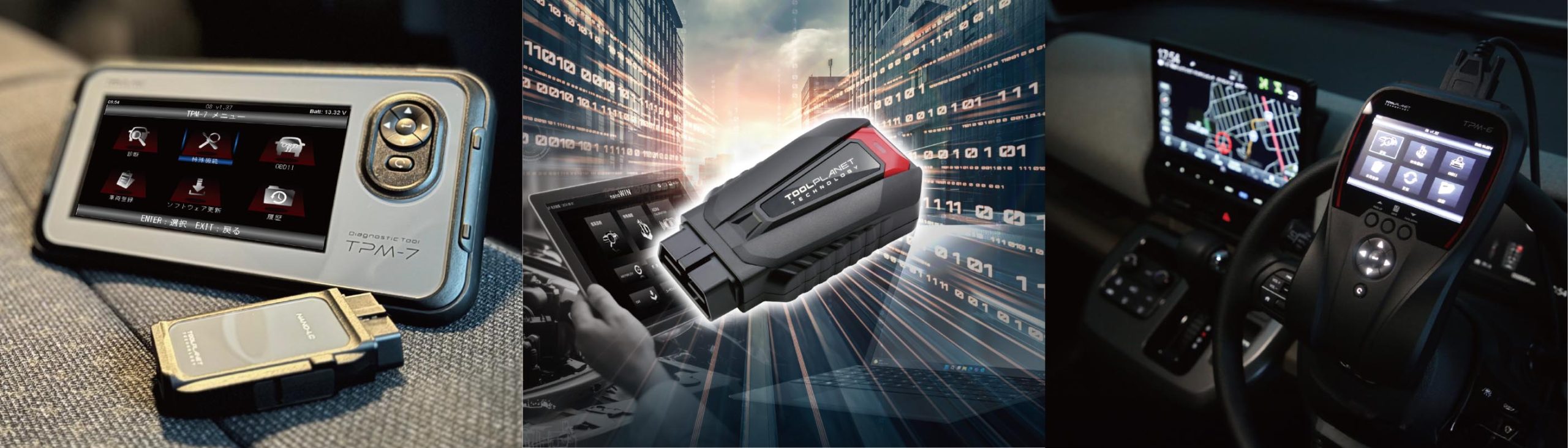 ツールプラネットは絶賛販売中モデル「nanoWIN」、「TPM-6」、「TPM-7 OBD Plus」、「TPM-3」、「ADAS CALIBRATION」などを中心に体験エリアを設けて展示する。