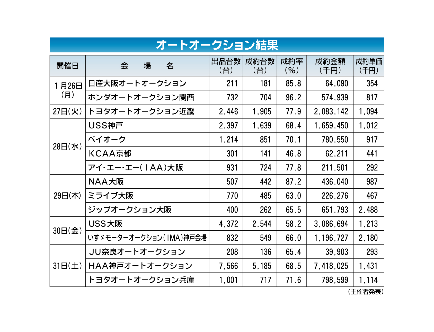 〈オートオークション結果〉近畿地区 2026/1/26~31