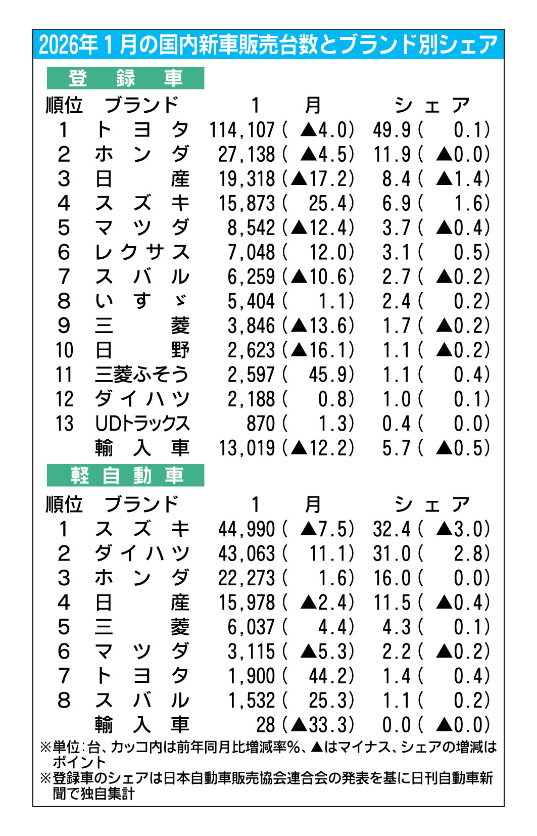 〈2026年1月の車名別販売台数〉