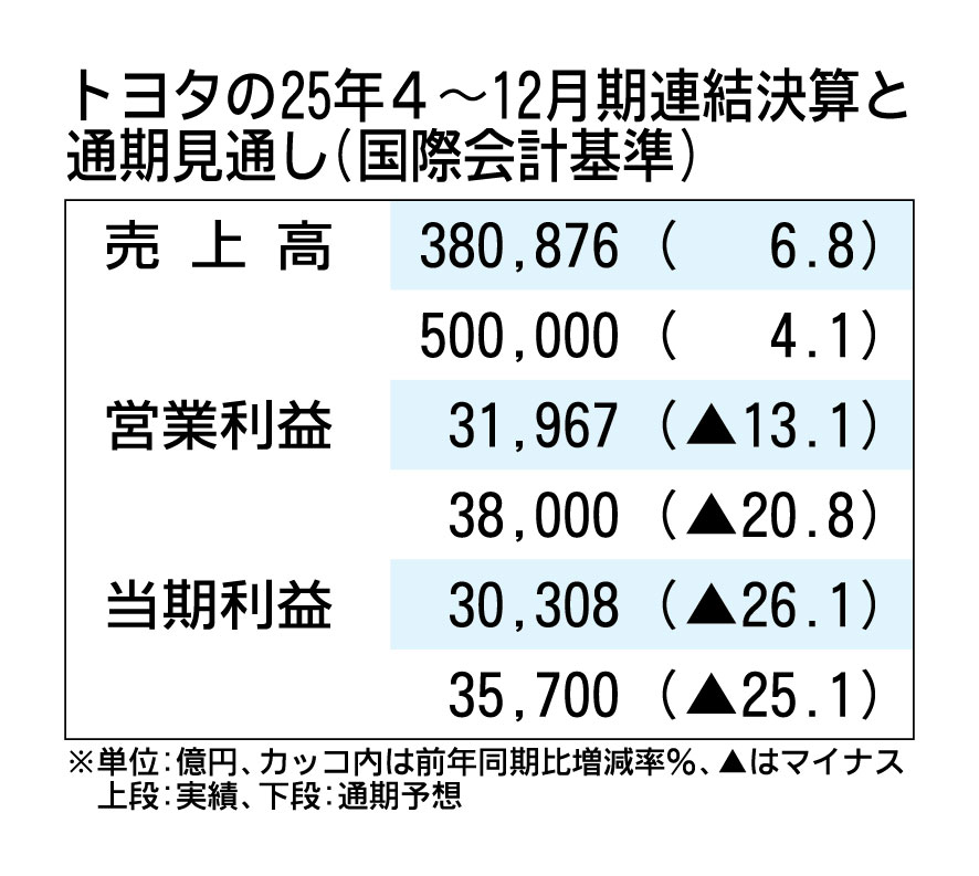 25年4~12月期の連結業績(国際会計基準、IFRS)は増収減益だった。営業収益は前年同期比6.8%増の38兆876億円で同期として過去最高を更新。記録更新は4年連続となる。営業利益は同13.1%減の3兆1967億円、当期純利益は同26.1%減の3兆308億円だった。営業利益は米国などでの販売増があったが、為替変動やトランプ関税、資材価格の高騰などが減益要因となった。