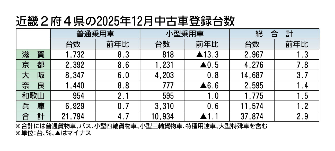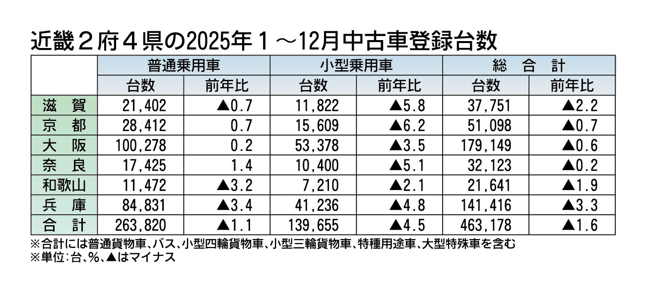 近畿2府4県の2025年(1~12月)の中古車登録実績(軽自動車を除く)がまとまった。新規・移転・変更手続きを合算した登録台数は、前年比1.6%減の46万3178台だった。前年を下回ったものの、コロナ禍明けの23年よりは高い水準を確保した。...