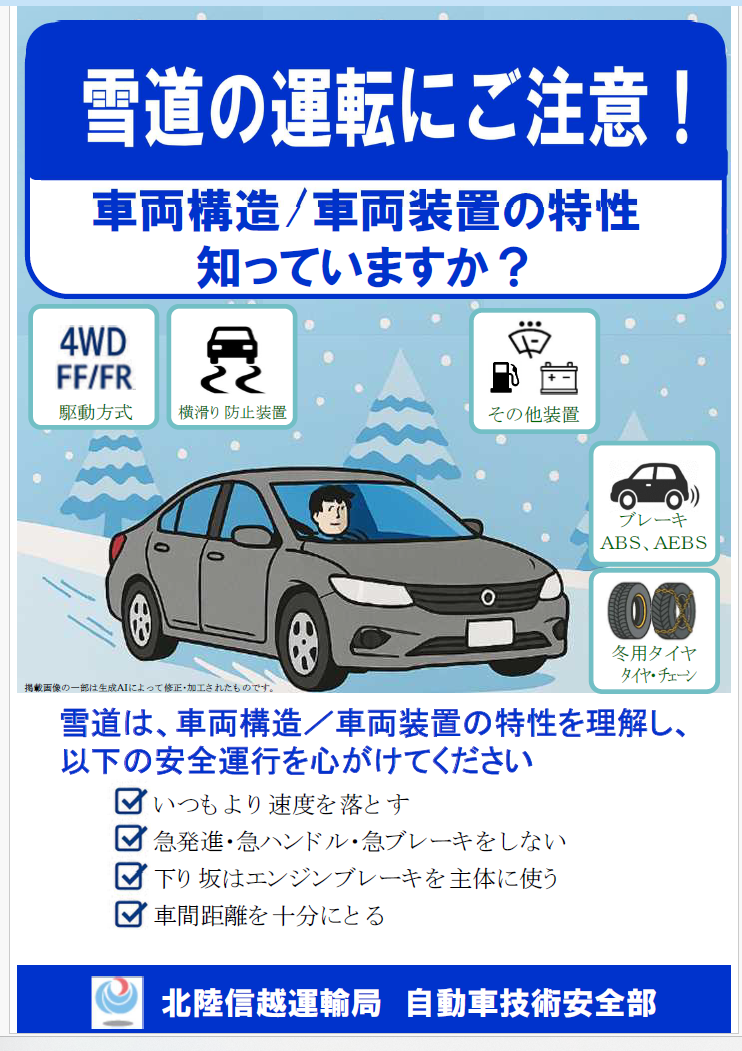 北陸信越運輸局(佐橋真人局長)自動車技術安全部は、大雪時の事故やスタックを防ぐための自動車使用者向けの周知チラシを作成した。雪道の運転対策として、自動車の構造や装置の特性の正しい理解を促す。チラシでは、冬季・雪道での車両構造や車両装置の特性...
