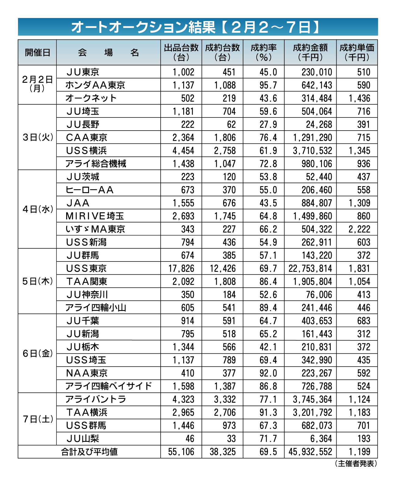 〈オートオークション結果〉首都圏 2026/2/2~7