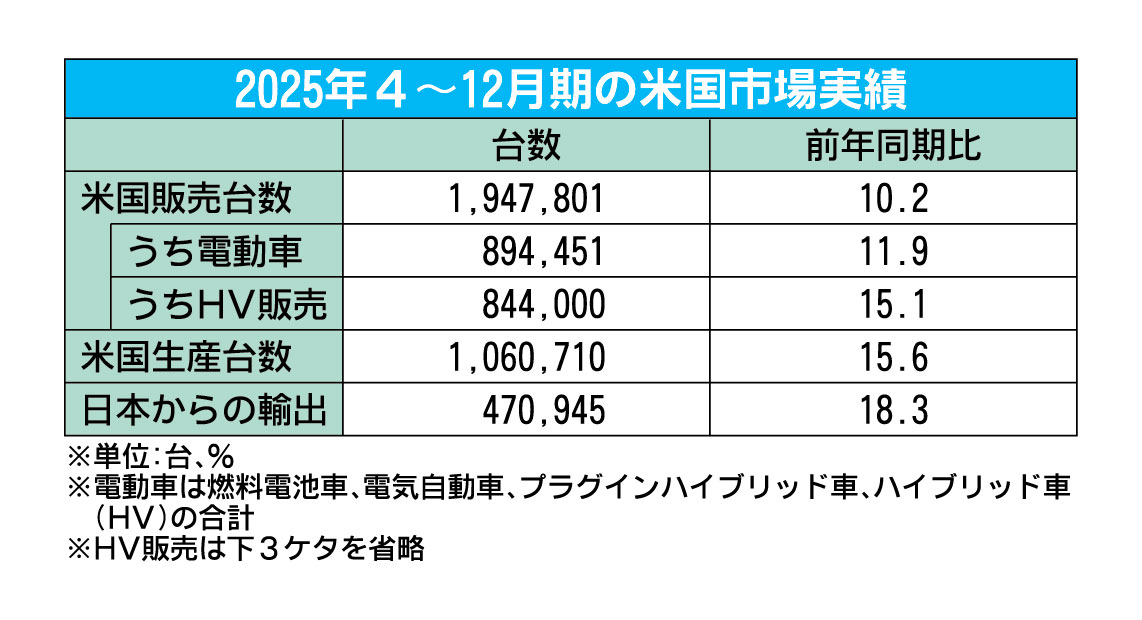 トヨタ自動車のグローバル販売で、米国市場の強さが際立っている。25年4~12月期の販売台数は前年同期比10.2%増の194万7801台となり、主要地域で唯一2ケタ増を記録した。ハイブリッド車(HV)が特に好調で、同期間の販売台数は約84万4...
