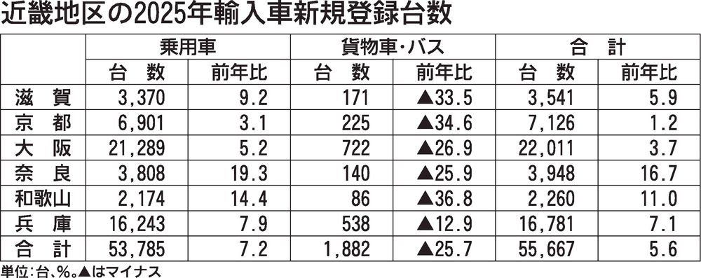 日本自動車輸入組合(JAIA)の発表によると、2025年1~12月の近畿地区の輸入車新規登録台数(外国メーカー車と日本メーカー車)は、前年比5.6%増の5万5667台と2年連続で増加した。外国メーカー車の乗用車が2年ぶりに4万台を上回った...
