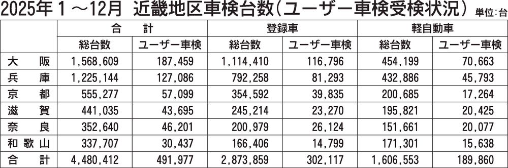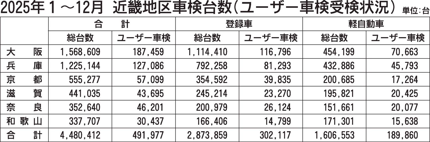 近畿2府4県2025年(1~12月)の継続検査(車検)台数(軽自動車を含む)は、前年比2.1%増の448万412台で、2年ぶりに増加した。車検の受検可能期間が25年4月より、従来の1カ月前から2カ月前に拡大されたことも背景に、車検の受検環...