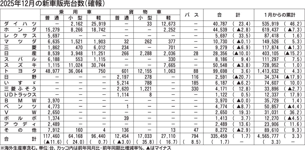 〈2025年12月の新車販売台数〉