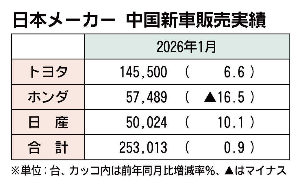 日本の自動車メーカー3社の1月の中国新車販売台数は、前年同月比0.9%増の25万3013台で、5カ月ぶりに増加した。「新エネルギー車(NEV)」の自動車購入税に当たる「購置税」の免税措置が2025年末で終了したものの、トヨタ自動車と日産自動...