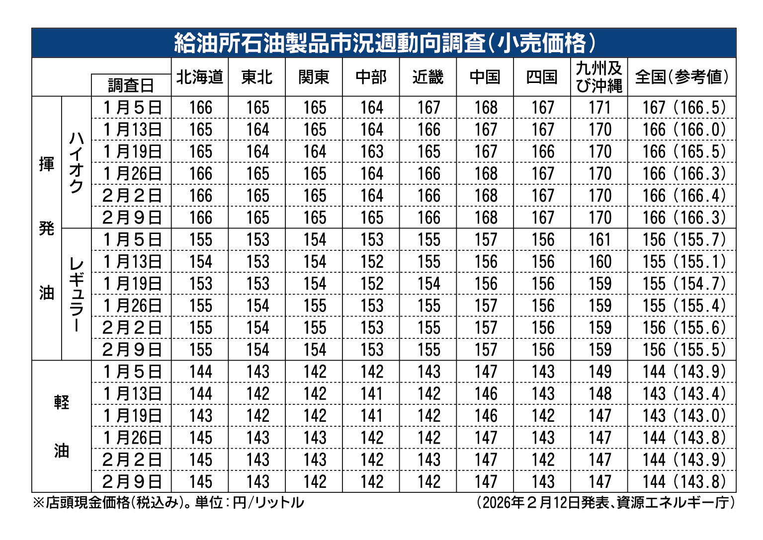 経済産業省が2月12日発表したレギュラーガソリン1リットル当たりの店頭価格(9日時点)は、全国平均で155円50銭だった。前週比で10銭安とほぼ横ばい。先週末の降雪や衆院選の投票でドライブ需要自体が冷え込む中、価格は動かなかった。地域別に見...